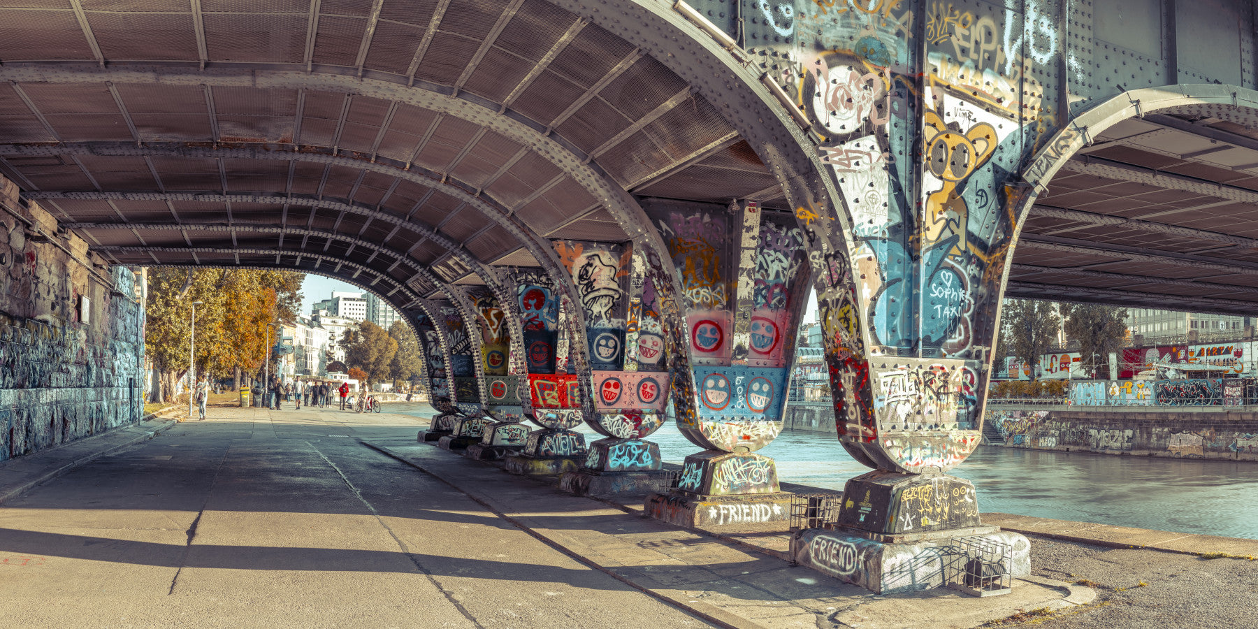 Graffiti on columns of bridge in Vienna, Austria. Transform your living space with this urban bridge wallpaper, bursting with color and character. The steel structure, alive with street art, creates a compelling focal point. Vibrant hues of red, blue, and yellow invigorate any room. This design makes a bold statement, perfect for the modern living room, a teen bedroom, or an energetic hallway. The industrial look blends seamlessly with contemporary interiors. This vibrant wallpaper for walls adds an artistic edge, creating a unique and eye-catching display.
