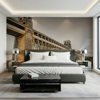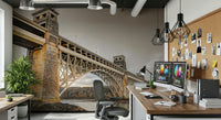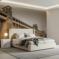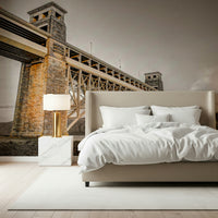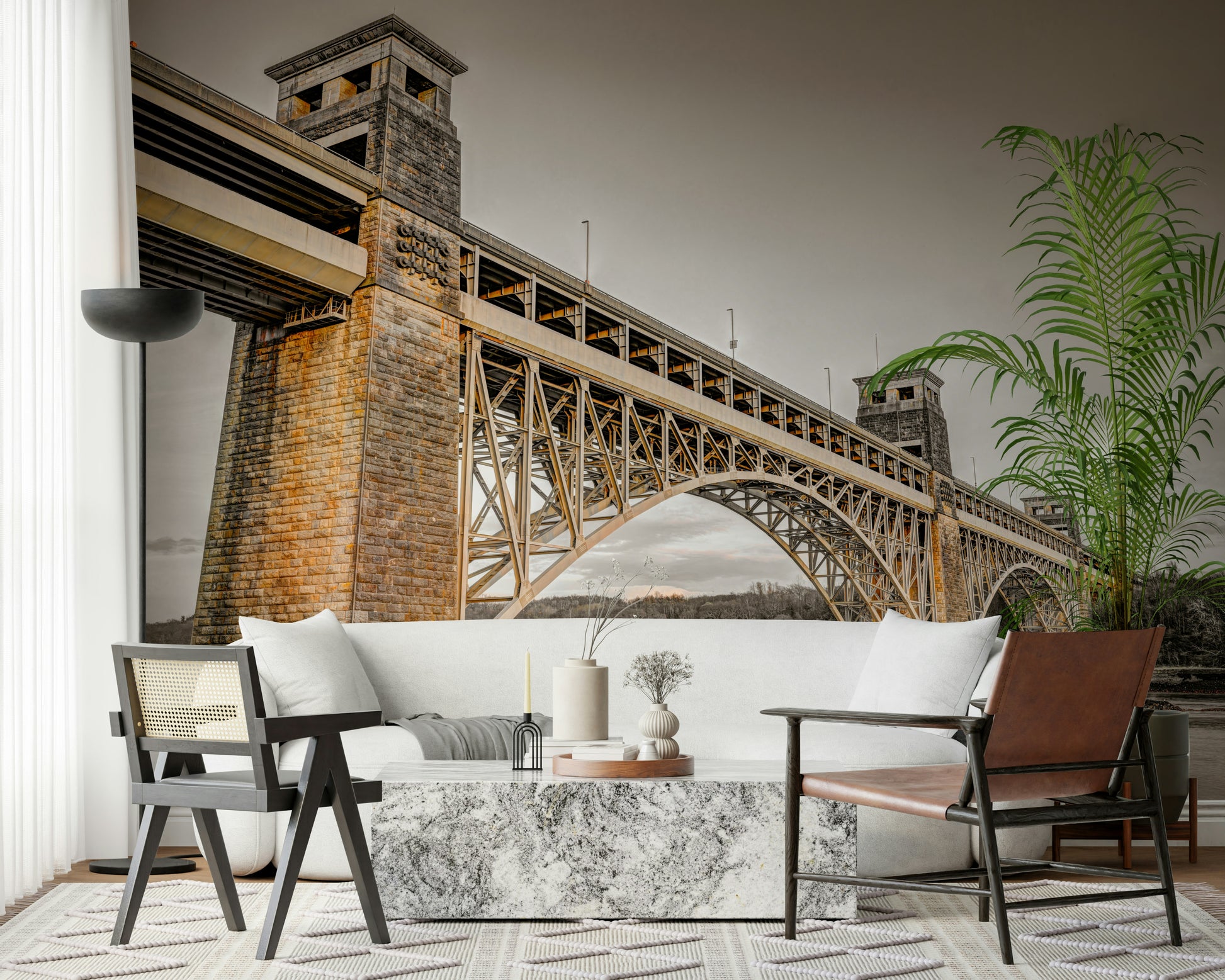 Britannia Bridge. This wallpaper features a striking image of a large bridge structure, its stone supports displaying rich textures. The design uses a sepia tone, highlighting the bridge's architecture against a muted sky and water. The intricate steel framework and stone blocks create a visually captivating pattern, suitable for a living room, office, or hallway. Use this industrial-inspired wallpaper for walls to add depth and a touch of urban sophistication, complementing modern or rustic interiors.