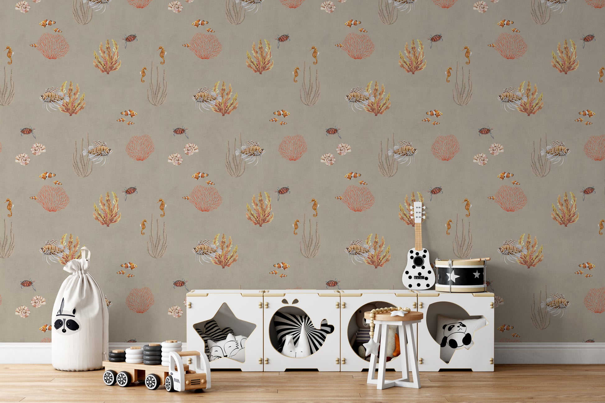 Bring the warmth of the ocean into your space with the Brown Oceanic Wonders Wallpaper Mural. This stunning design captures the beauty of marine life with earthy brown tones, delicate coral reefs, and intricate sea creatures like seahorses, clownfish, and lionfish. The soft, natural hues create a cozy and inviting ambiance, perfect for coastal-inspired decor, beach houses, or ocean lovers. Crafted from high-quality materials, this wallpaper is easy to install and remove, making it a stylish and practical choice for transforming your walls. Let the elegance of the underwater world add depth and charm to your home or office.