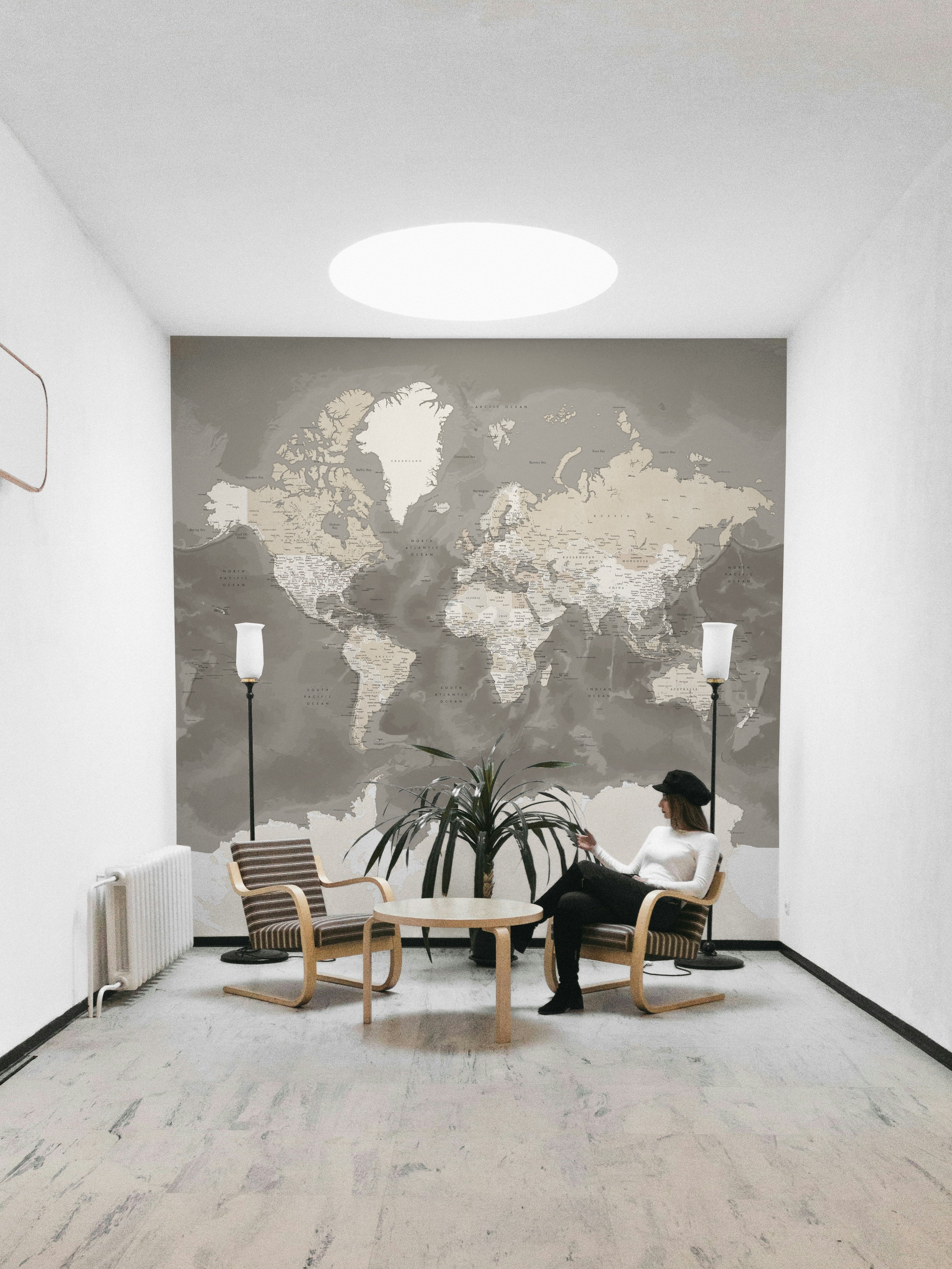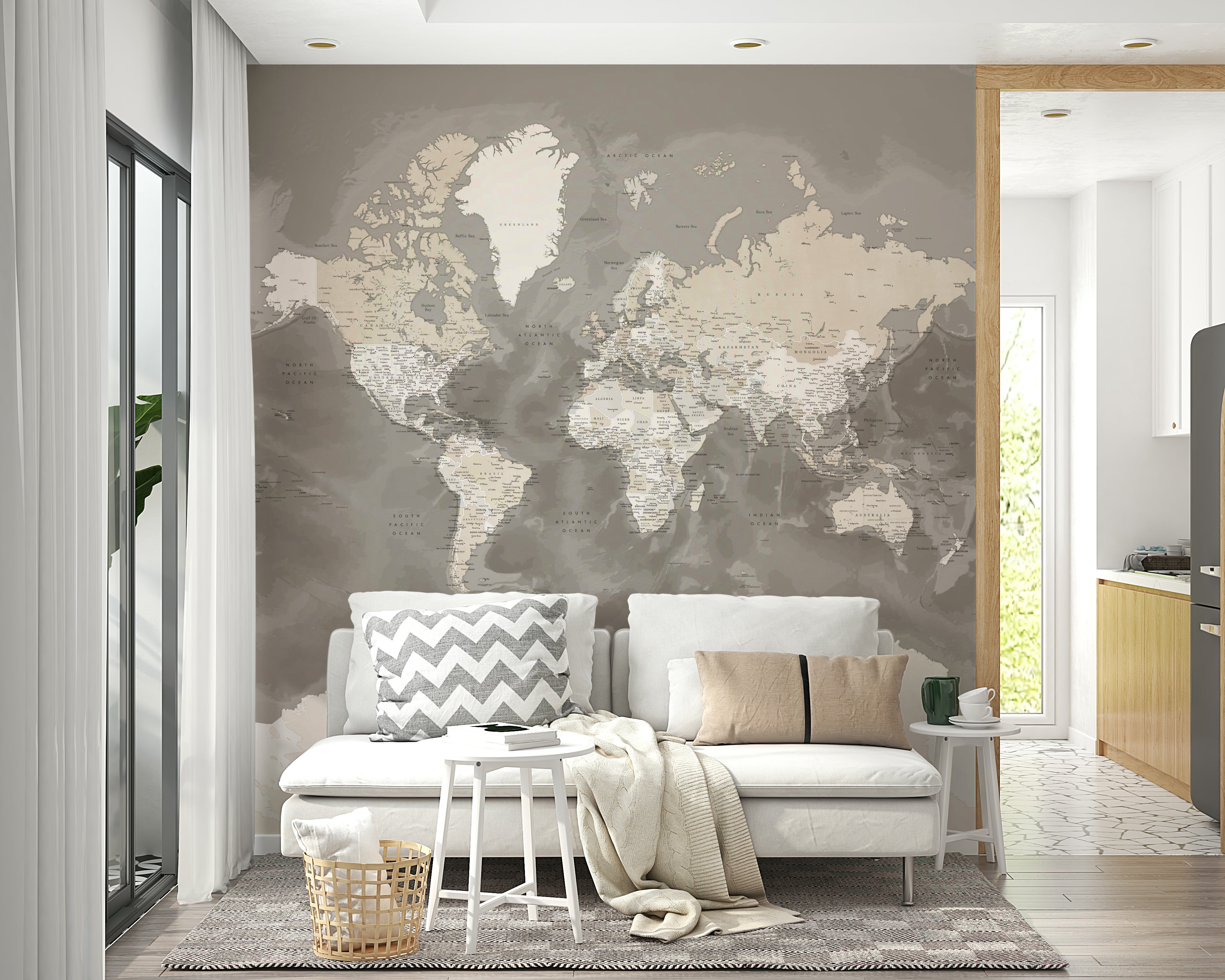 Add warmth and worldly charm to your space with the Brown Watercolor World Map Wallpaper. Featuring soft brown, beige, and taupe tones in a flowing watercolor design, this map mural brings a calming, earthy aesthetic to any room. Detailed with labeled countries and cities, it blends function with artistry—ideal for home offices, living rooms, or travel-themed decor. The neutral palette complements rustic, minimalist, and modern interiors alike. Available in peel-and-stick or traditional wallpaper options, it’s easy to apply and made with eco-friendly materials. Discover the beauty of global design with this timeless and tranquil wall map.