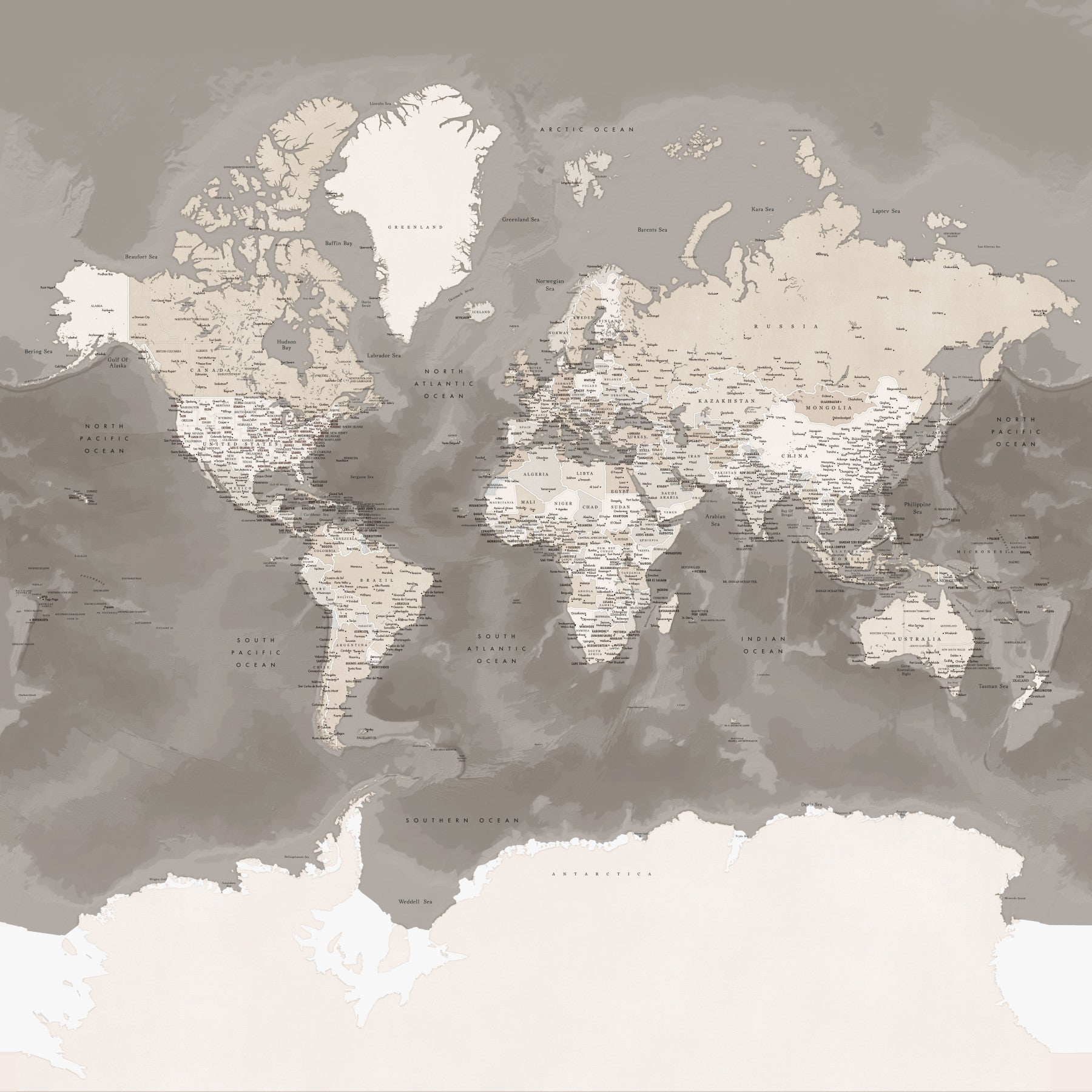Peel and stick world map in rich brown hues