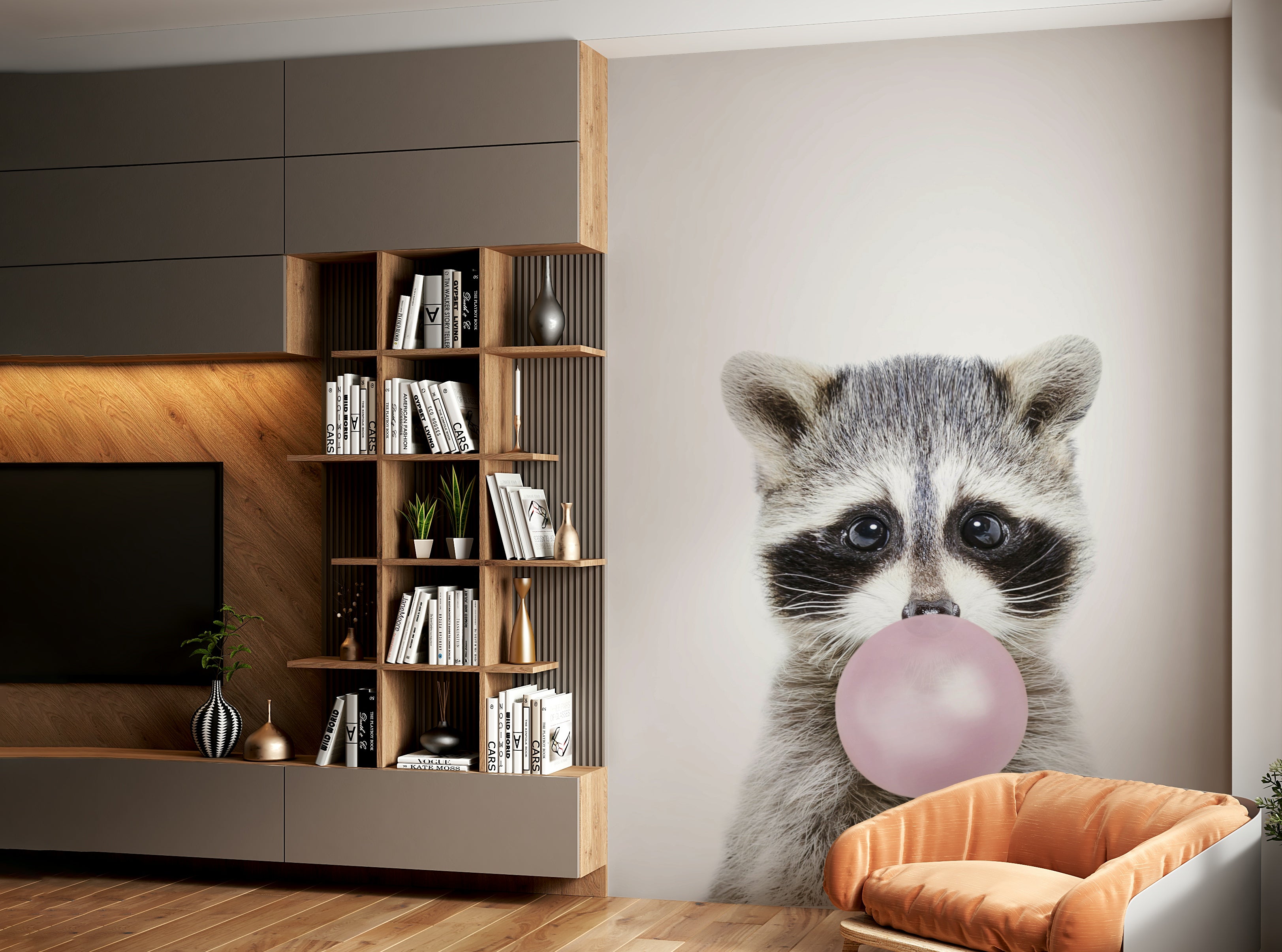 Playful bubble gum raccoon wall mural for creative decor