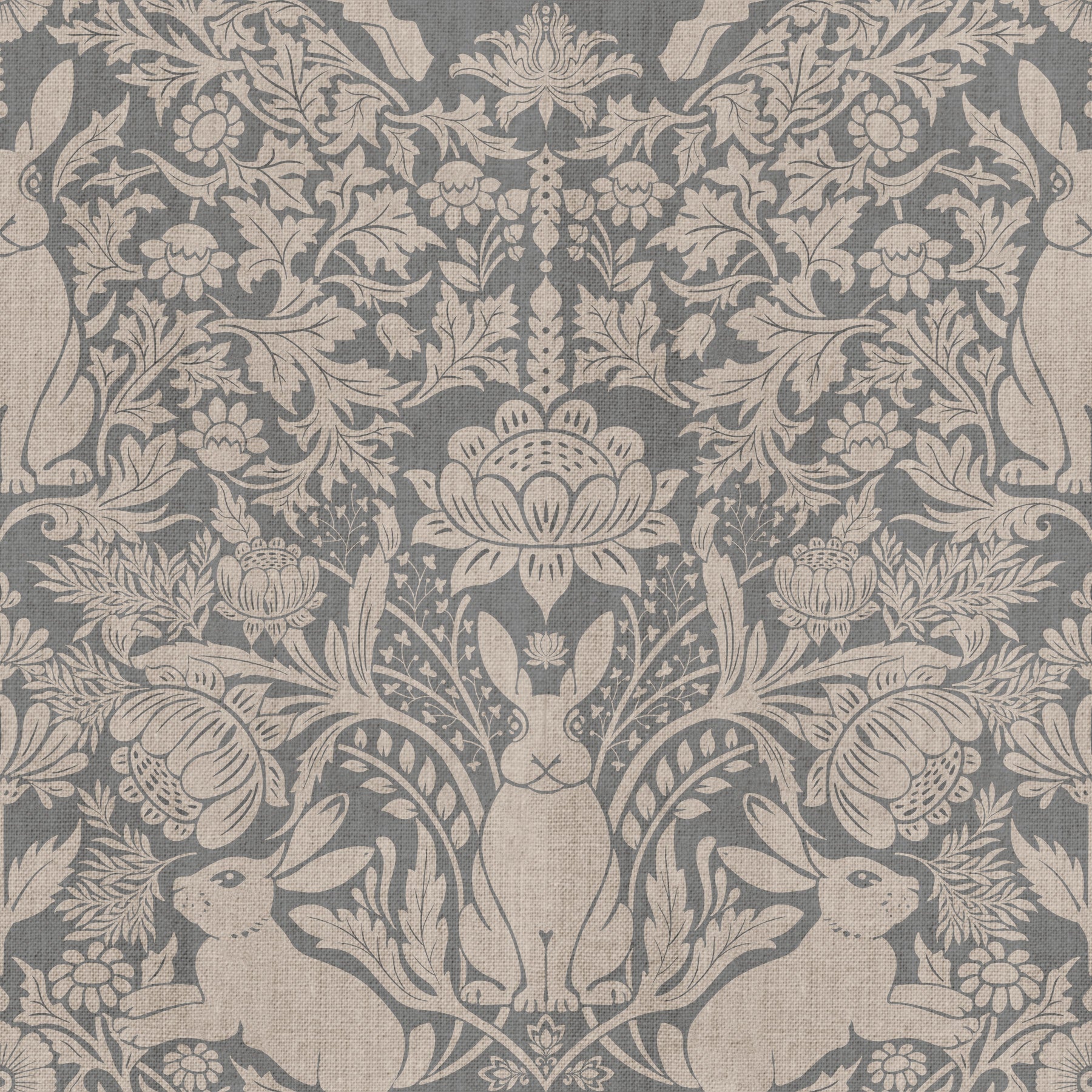 Bring a touch of whimsical elegance to your space with this damask-style wallpaper. The delicate design features bunnies nestled amongst blooming flowers and swirling foliage. Its neutral beige and grey tones create a soft and inviting atmosphere. This wallpaper for walls looks great in a bedroom, living room, or hallway. The understated colour palette lets it easily complement a variety of interior styles, from traditional to modern farmhouse.
