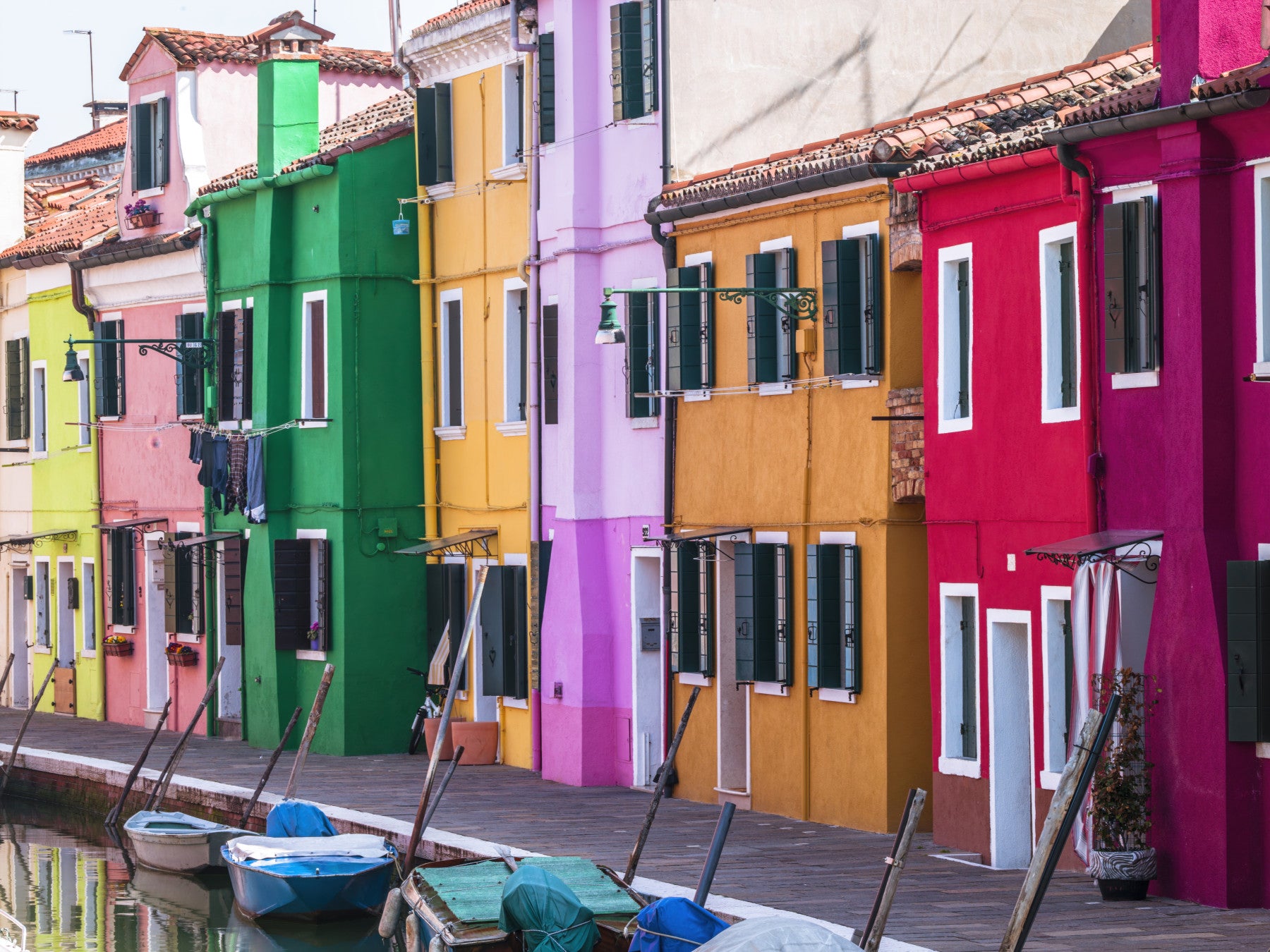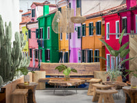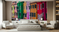 Multi-Coloured houses next to a canal, Burano, Italy. Bring the vibrant charm of Burano, Italy, into your home. This wallpaper for walls features a row of brightly painted houses along a canal, reflecting a cheerful and lively scene. The colours—red, pink, yellow, and green—pop with energy, creating a captivating focal point. The design complements interiors with a playful and artistic touch. Ideal for a living room, dining room, or hallway, this wallpaper turns any space into a delightful visual escape. Embrace the spirit of Italian coastal living and transform your walls with this captivating design.