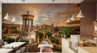 Edinburgh cityscape from Calton Hill, Scotland. Ascend to serenity with 'Calton Hill,' a breathtaking wallpaper that captures the golden hour over Edinburgh. This image presents a stunning panoramic view from the iconic Calton Hill, dominated by the elegant Dugald Stewart Monument. As the sun dips below the horizon, the sky blazes with warm hues of orange and gold, casting a magical glow over the cityscape. Edinburgh Castle, nestled atop its volcanic rock, stands proudly amidst a tapestry of historic buildings and winding streets. The image evokes a sense of timeless beauty, inviting you to immerse yourself in the rich history and architectural grandeur of Scotland's capital. Perfect for adding a touch of sophistication and wanderlust to any screen, 'Calton Hill' is a visual escape to a city steeped in culture and history.