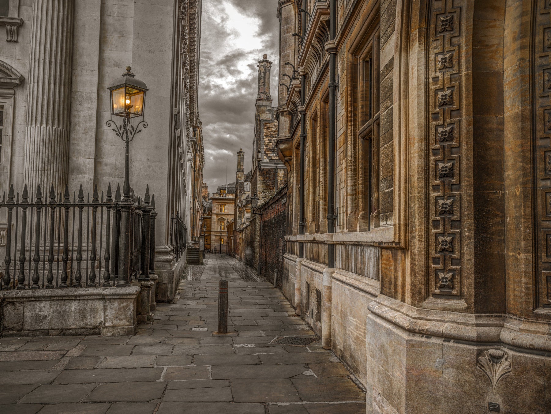 Elegant Cambridge lane with lamppost and stone architecture mural.