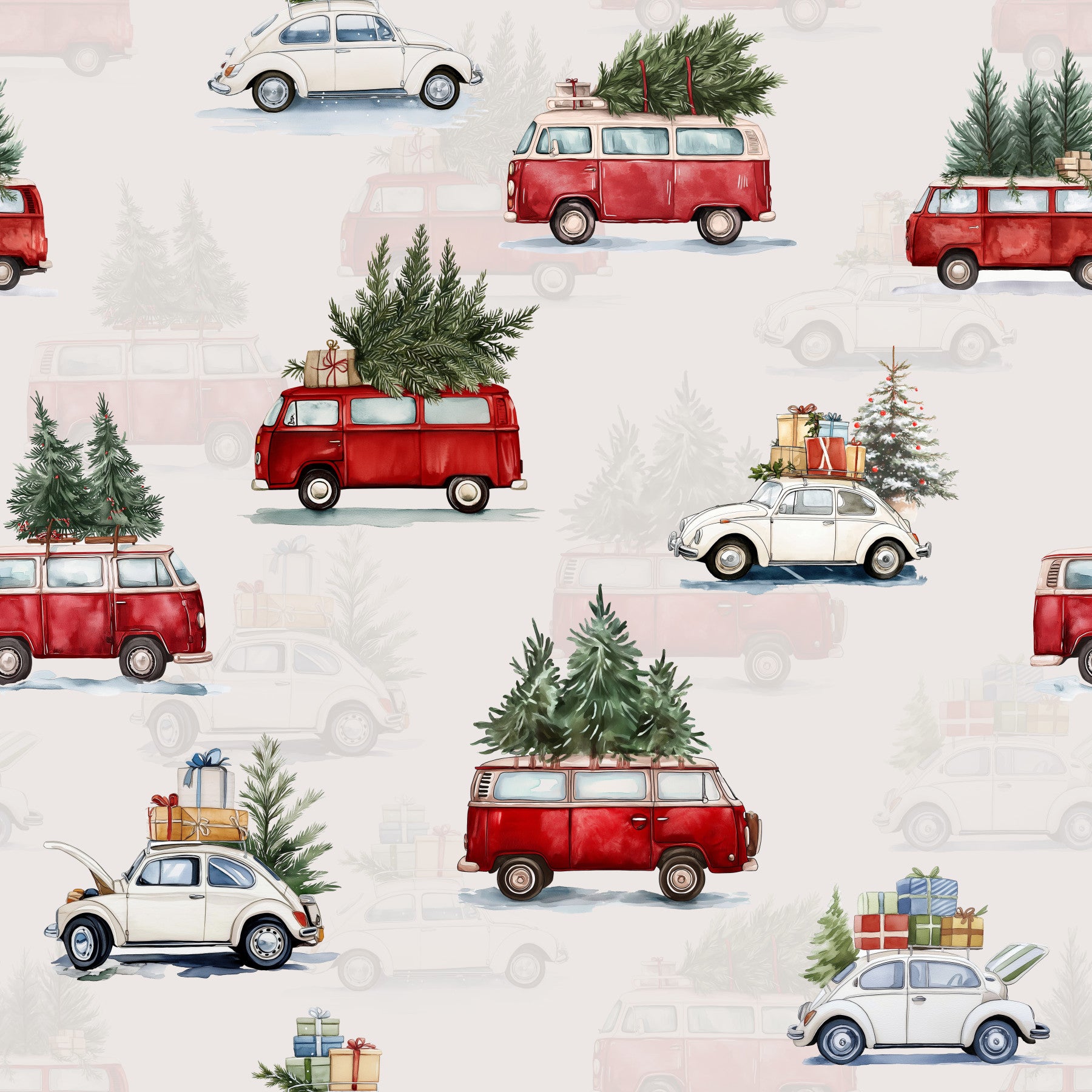 Evoke the warmth and nostalgia of the holiday season with "Camionette," a delightful wallpaper depicting vintage charm. This charming design features classic red Volkswagen vans and white Beetles, playfully transporting Christmas trees and stacks of beautifully wrapped presents. Rendered in a soft, watercolour style, the wallpaper exudes a handcrafted, artistic feel. Each vehicle is meticulously detailed, capturing the iconic design elements of these beloved classics. The muted colour palette, dominated by festive reds and greens against a neutral backdrop, creates a cosy and inviting atmosphere, perfect for adding a touch of retro holiday cheer to any space. Bring a touch of whimsical wanderlust and holiday spirit to your screens with "Camionette."