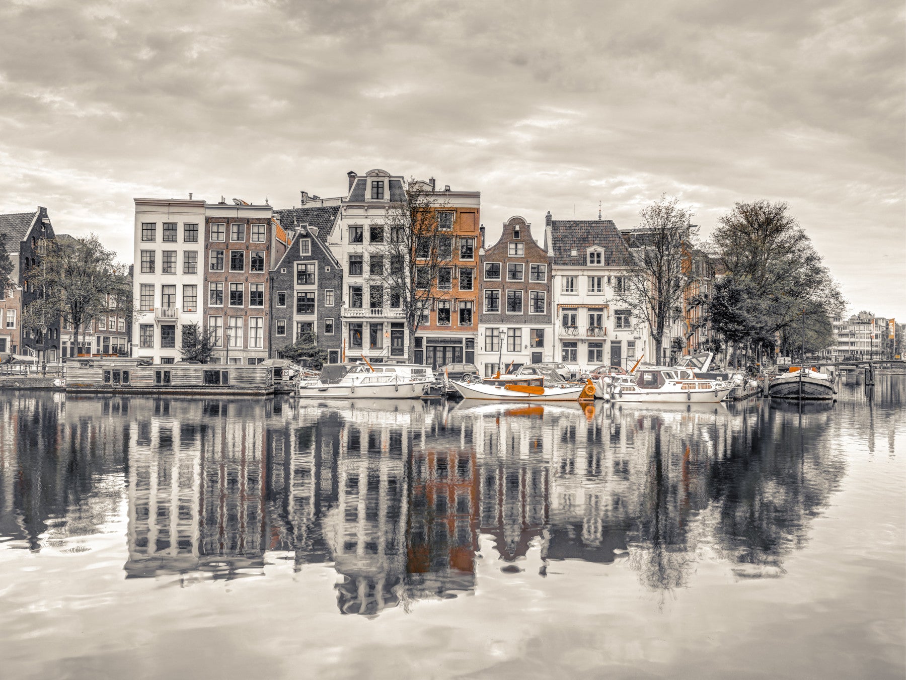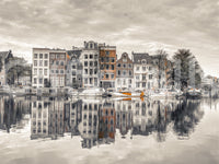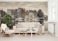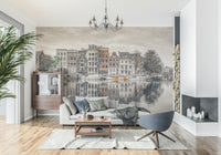 Elevate your home decor with this harmonious urban wallpaper for walls. This captures the architectural beauty of Amsterdam's canals and its tranquil water reflections. The wallpaper features a muted colour palette, with subtle pops of terracotta that bring calmness and character to any space. It works beautifully in living rooms, bedrooms, or home offices, providing a peaceful, sophisticated backdrop. The reflections enhance depth, while the architectural details add a touch of classic European charm. This wallpaper complements any interior style, adding refined interest.