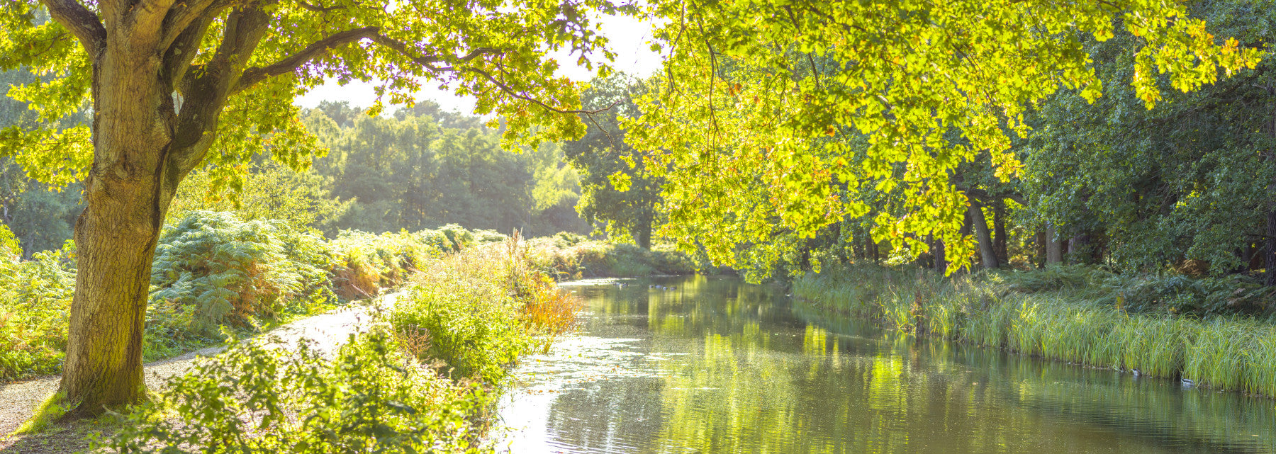 Basingstoke canal in countryside, UK. Bring the peace of nature indoors with this scenic wallpaper for walls. It shows a tranquil canal, framed by lush trees in bright greens and warm yellows. The sunlight adds a touch of serenity to any room. Ideal for a living room or bedroom, this wallpaper will make your space feel calm and inviting. The design works well with both modern and traditional interiors, offering a fresh, natural element.