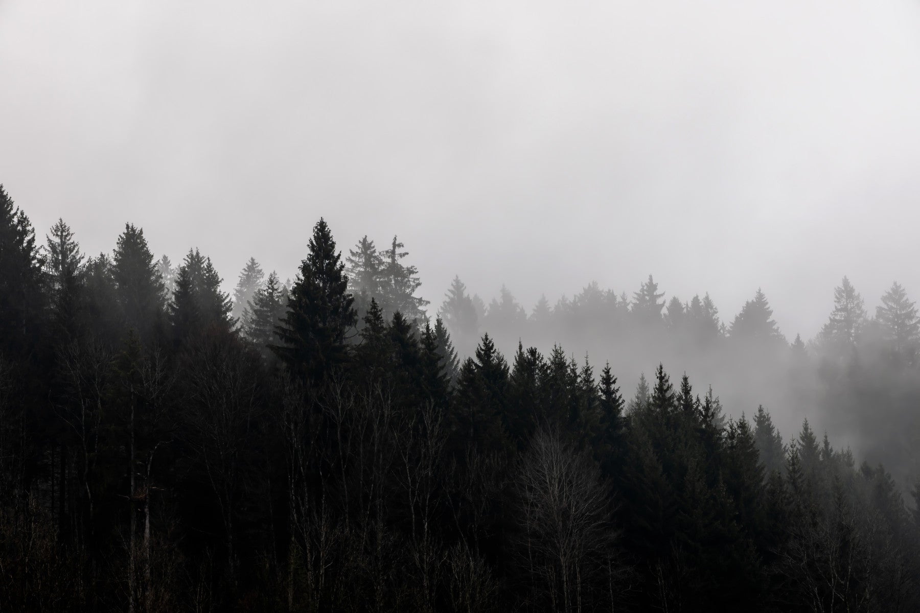Canyon Woodland Haze mural wallpaper, somber evergreens in heavy fog.