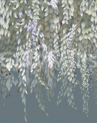 Bring a touch of serene beauty indoors with this wisteria-inspired wallpaper. It showcases delicate leaves and blossoms in soft, muted tones against a calming grey-blue backdrop. This soothing pattern creates a tranquil atmosphere. Use this wallpaper for walls to enhance bedrooms, living rooms, or hallways. The elegant design complements various interior styles from classic to modern, adding a touch of natural grace to your space. Enjoy a peaceful ambiance.