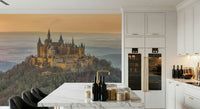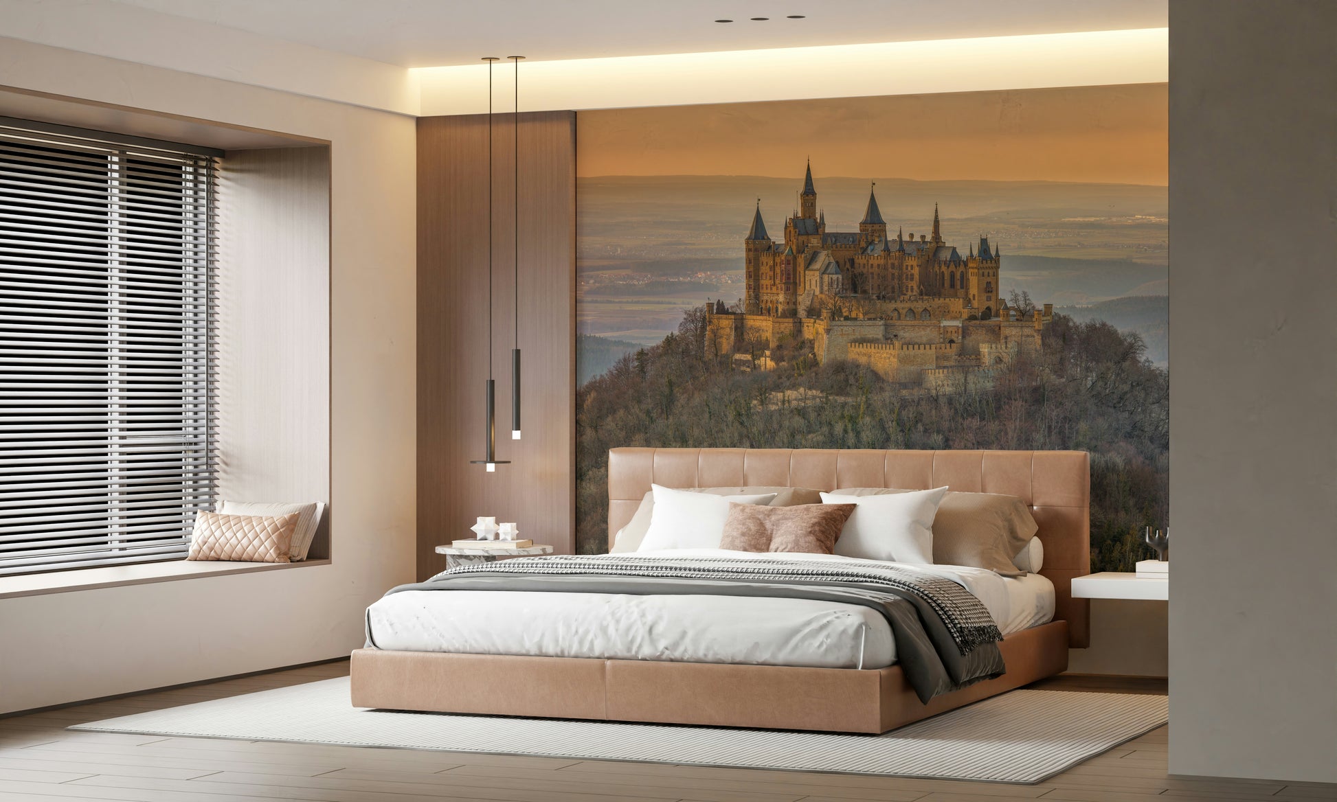 Elevate the atmosphere in any room with this striking wallpaper for walls. It depicts a grand castle perched atop a forested hill, bathed in the soft glow of dawn. The earthy tones of the stone architecture contrast beautifully with the gentle peach and amber sky, bringing a warm, inviting ambiance to living rooms, dining spaces, or studies. The detailed design adds depth and a sense of history to interiors, creating a focal point that sparks imagination. Use this wallpaper to transform your home into a regal retreat.