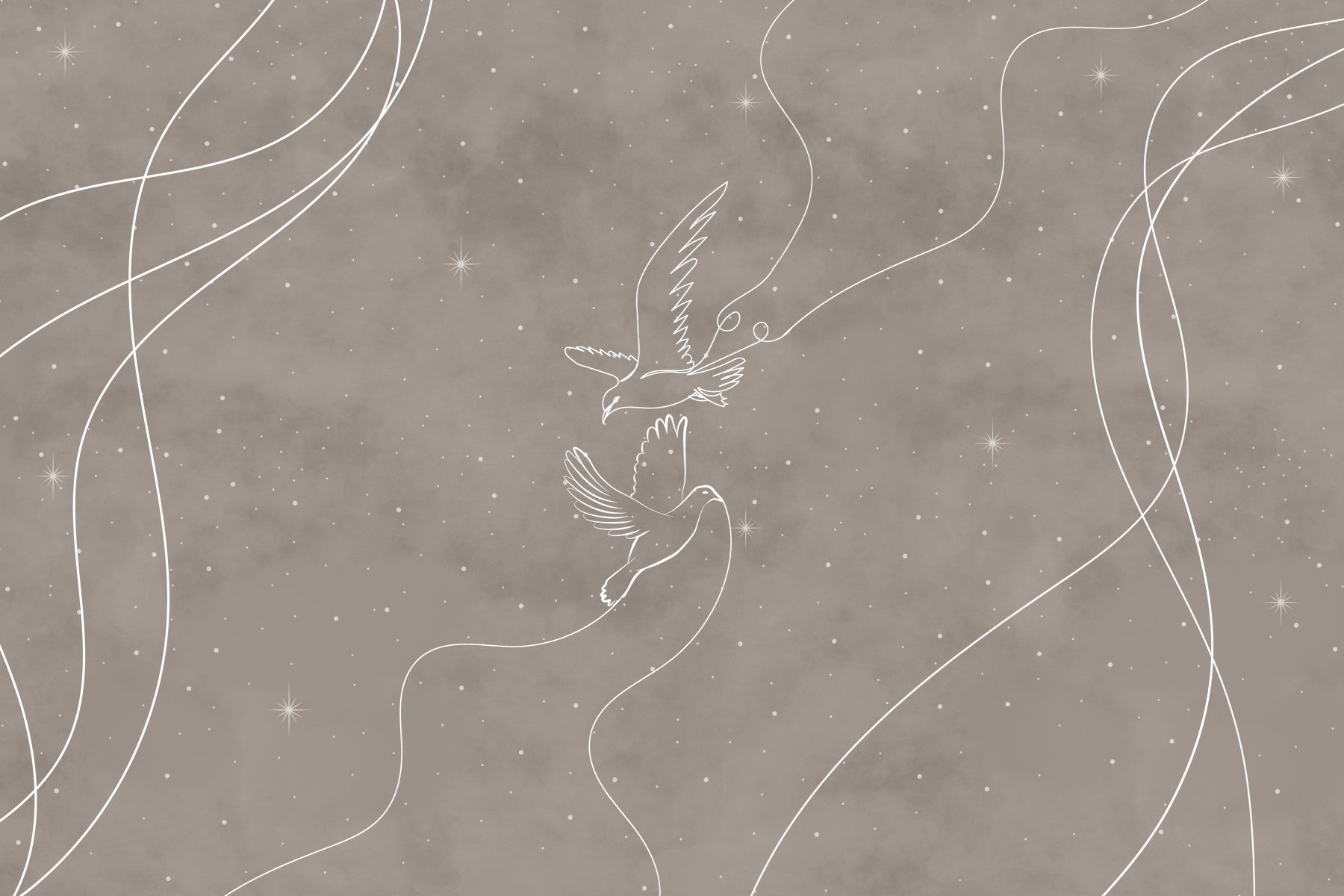 Drift into a serene dreamscape with this calming wallpaper for walls. Delicate white doves take flight amidst a soft, neutral-toned sky sprinkled with twinkling stars. Flowing lines add a touch of whimsical movement. This design brings peace and tranquility to any room. Place it in a bedroom, nursery, or study to create a relaxing and inviting atmosphere. The subtle colors and elegant simplicity work well with modern, minimalist, or even rustic interior styles.