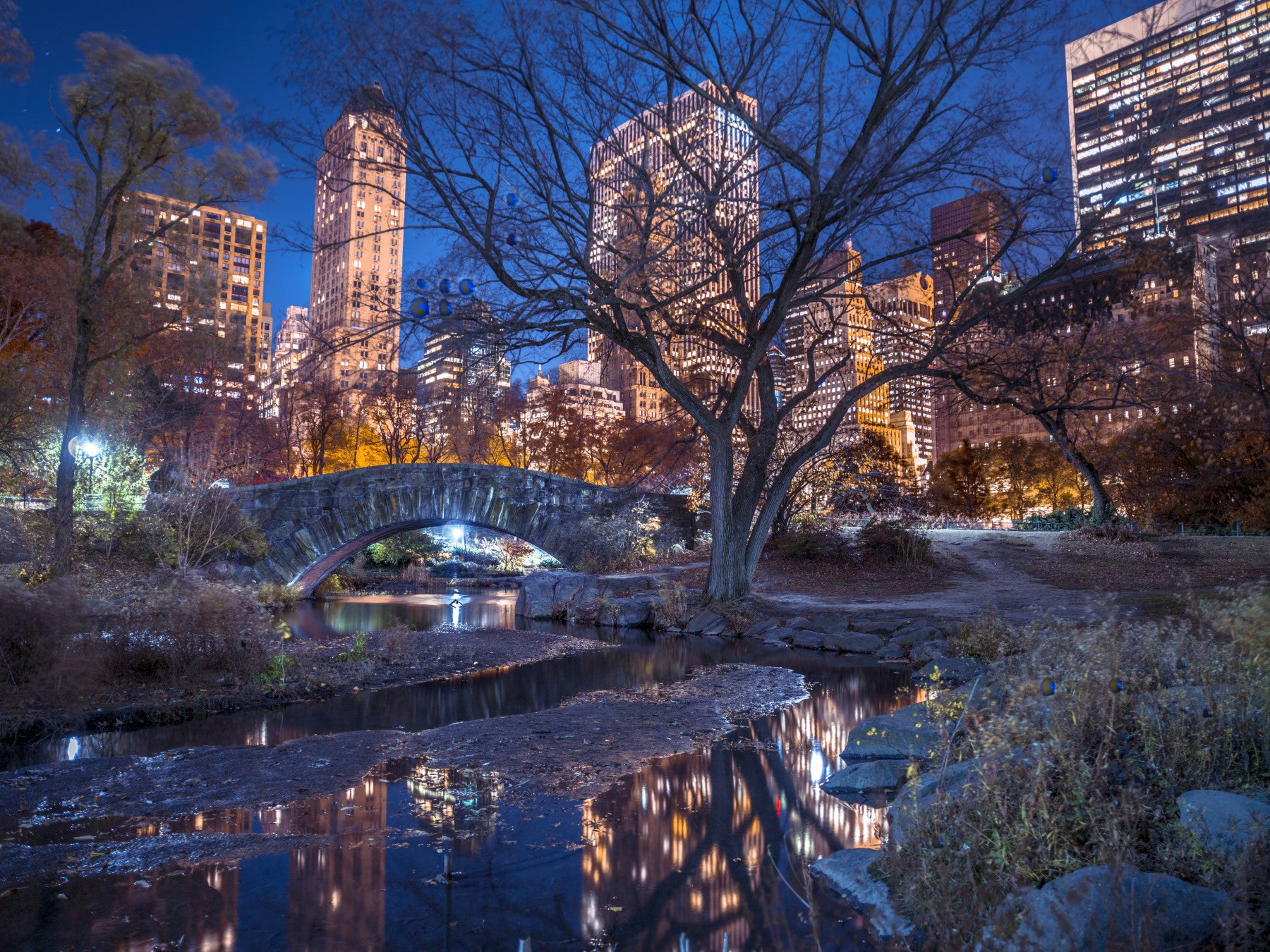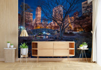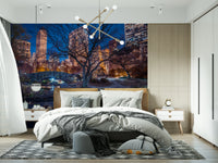 Evening view of Central Park in New York City. Escape to the tranquil heart of Manhattan with 'Central Park at Night,' a captivating wallpaper that encapsulates the serene beauty of this iconic landmark after dusk. This stunning image portrays a nocturnal scene where the park's peaceful ambiance meets the dazzling skyline of the city. A quaint stone bridge gracefully arches over a calm stream, reflecting the warm glow of the surrounding skyscrapers, their lights twinkling like scattered stars against the dark blue canvas of the night sky.