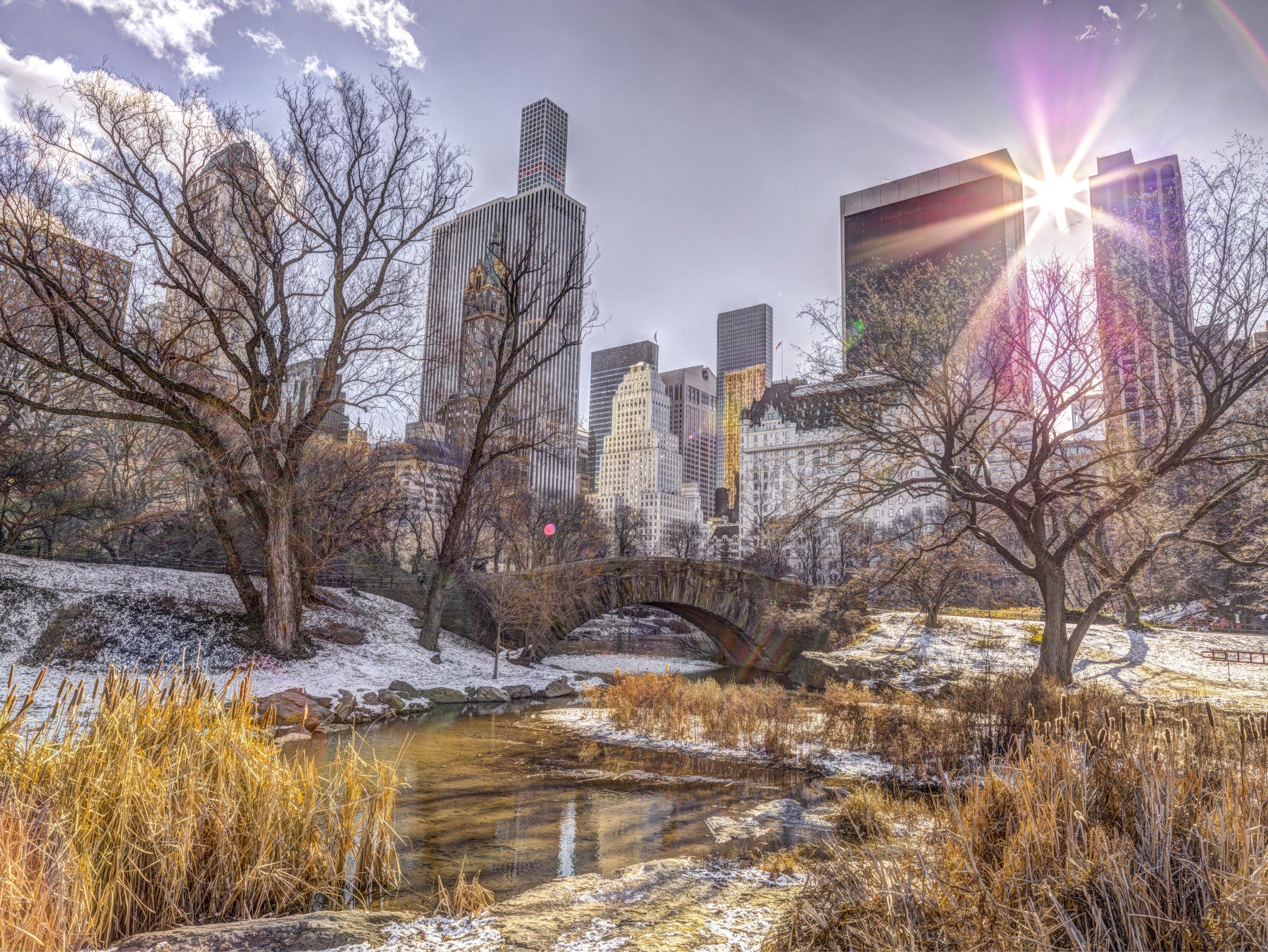 Adorn your home with the serene beauty of our Central Park NYC Wall Mural. This captivating mural wallpaper captures a picturesque winter scene in Central Park, featuring a charming stone bridge arching over a gentle stream, surrounded by bare trees dusted with snow, and the iconic New York City skyline rising in the background under a bright, slightly cloudy sky with a lens flare from the sun. It's an ideal wallpaper for walls to introduce unique character and a sense of peaceful urban nature to any room. The contrast between the tranquil park and the majestic cityscape offers a captivating backdrop, ensuring your home feels both serene and beautifully connected to the heart of New York City.