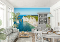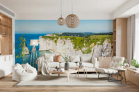 Bring the majesty of the coastline into your home with this chalk cliffs vista. This wallpaper for walls depicts the striking beauty of soaring white cliffs meeting the turquoise sea. The natural elegance of the design brings depth and texture to any room, particularly enhancing living rooms, bedrooms, or even bathrooms where you can create your own serene coastal escape. The cool colour palette of blues, greens, and whites lends itself beautifully to minimalist, modern, or coastal interior styles, creating an atmosphere of calm and natural splendour.