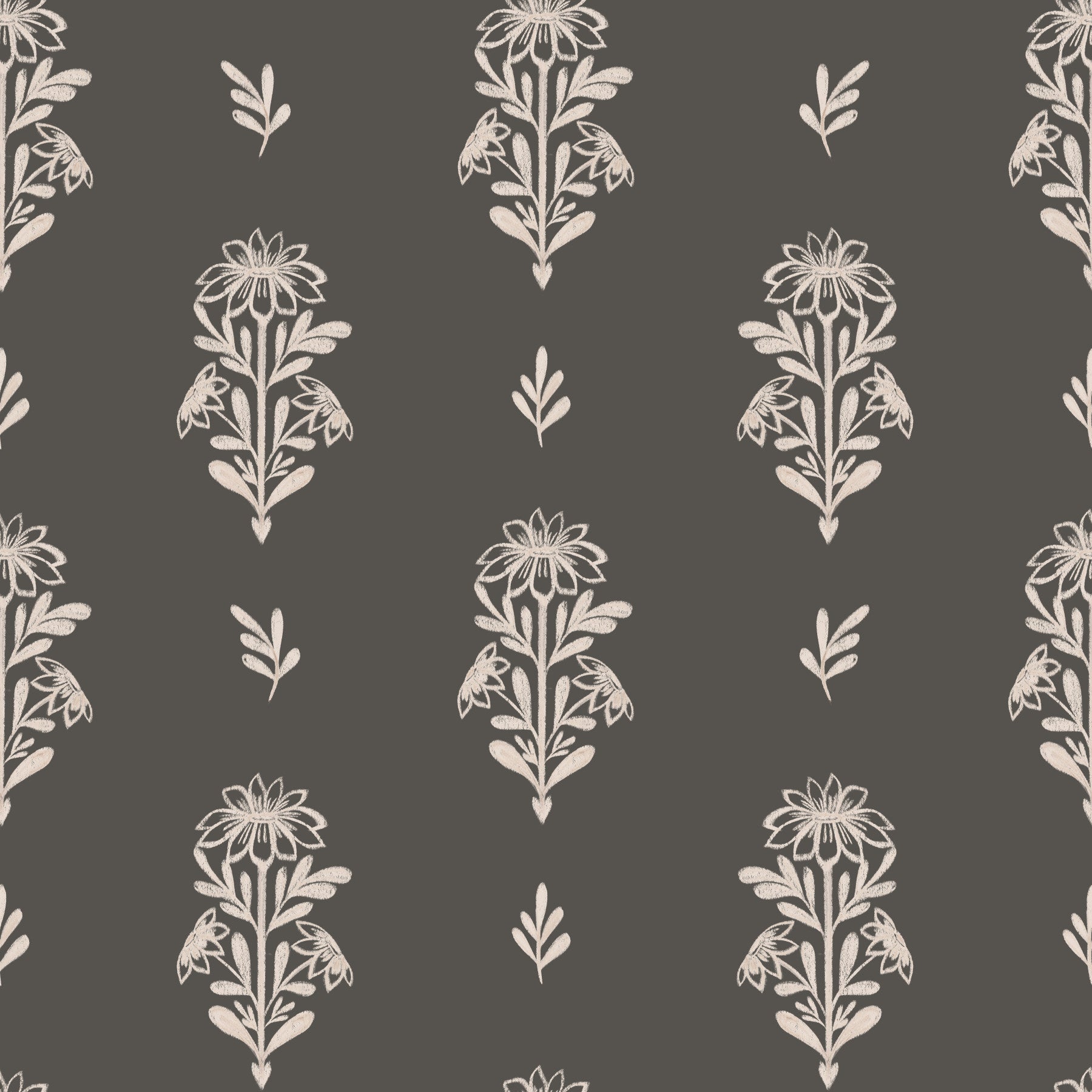 This wallpaper showcases a delicate and understated floral design, rendered in soft, chalky off-white hues against a sophisticated charcoal grey background. The hand-drawn style of the floral motifs evokes a sense of handcrafted charm and simple elegance. The repeating pattern is subtle yet captivating, creating a calming and sophisticated atmosphere. Perfect for bedrooms, living rooms, or any space where a touch of understated elegance is desired. The muted color palette and simple design make it a versatile choice that complements various interior styles, from minimalist to modern farmhouse.