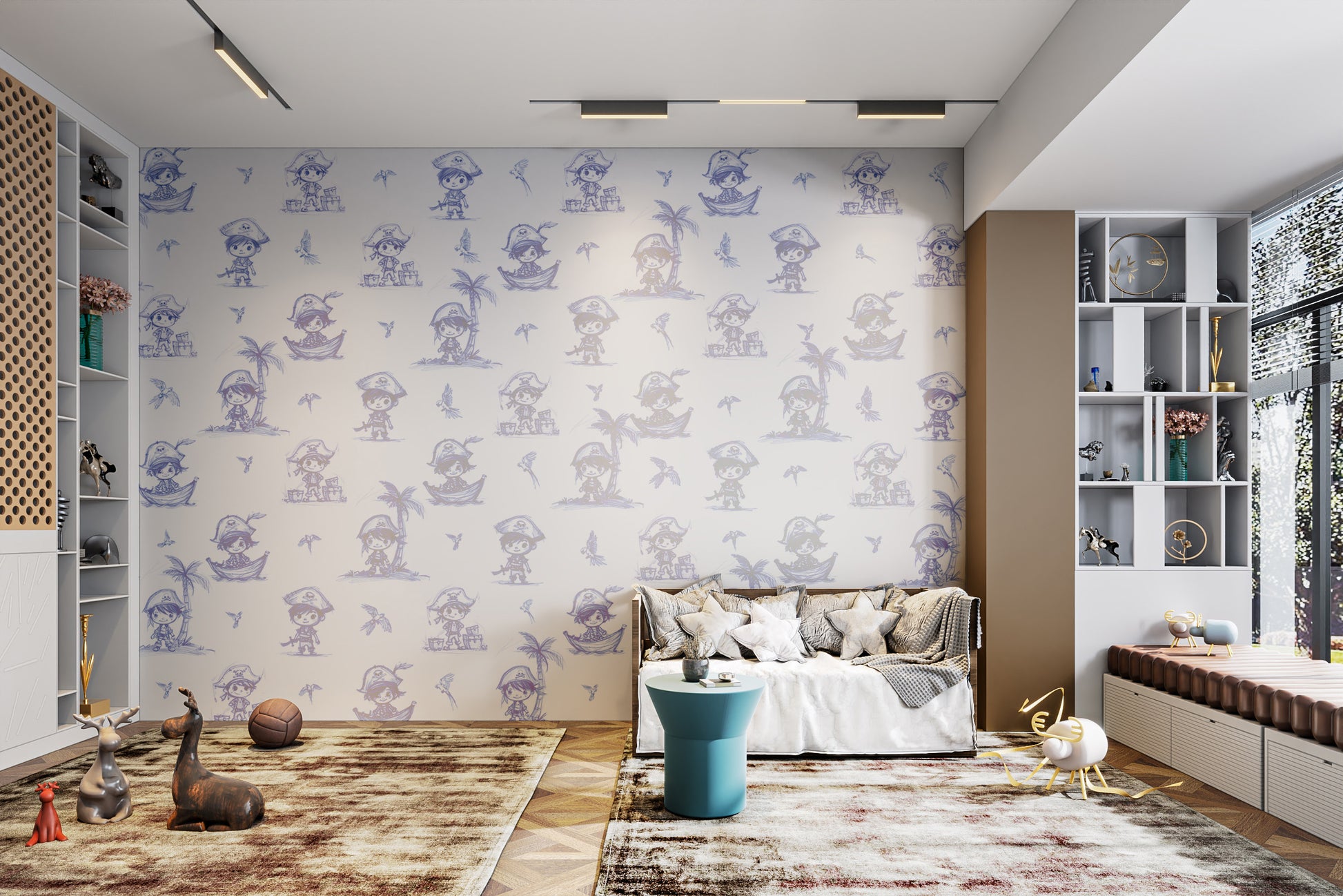 Adorable pirate-themed wallpaper for kids' rooms with nautical vibes.
