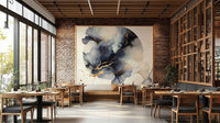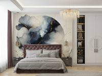 This wallpaper evokes a sense of tranquility with its abstract design. Delicate ginkgo leaves in shades of gray and blue are beautifully rendered, their fine lines contrasting with the fluid, flowing forms of the alcohol ink background. Subtle touches of gold add a touch of luxury and elegance, enhancing the overall ethereal atmosphere. The circular composition creates a sense of harmony and balance, making it a perfect choice for a calming and sophisticated space. The piece is both minimalist and artistic, offering a visually appealing yet understated aesthetic.