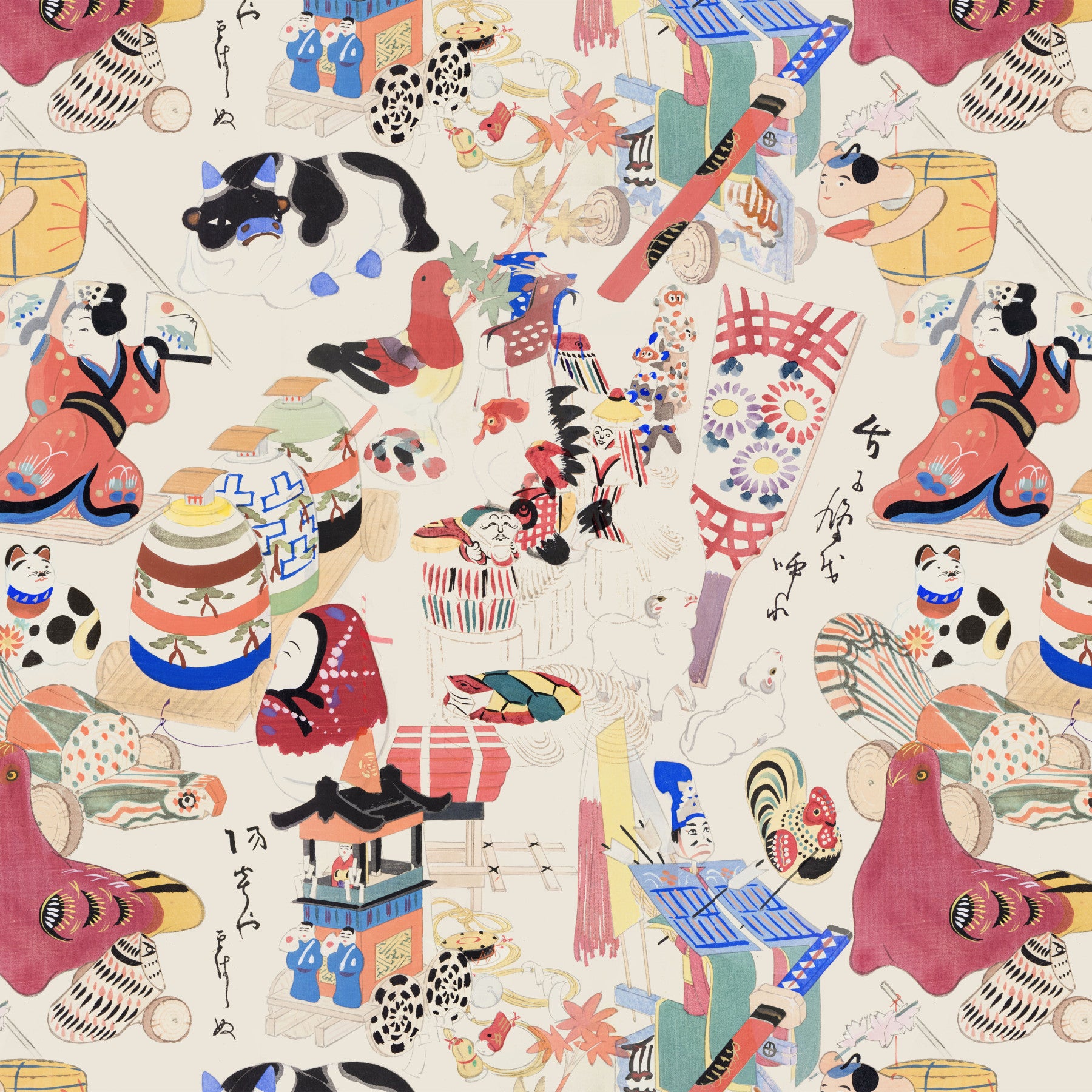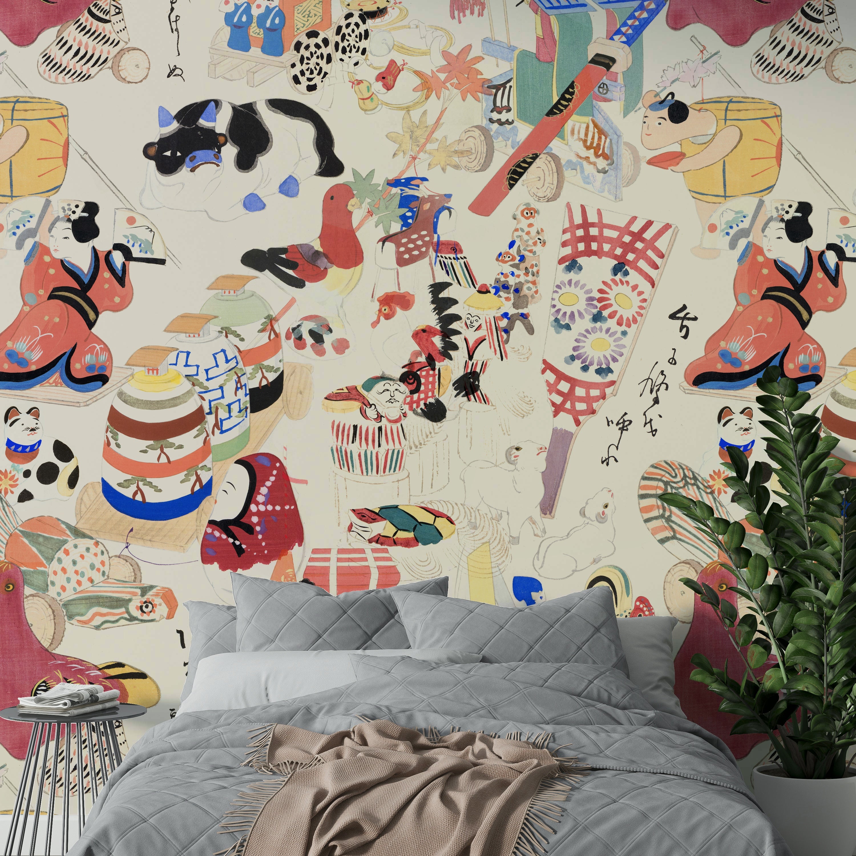 A vibrant and whimsical Chihiro-inspired wallpaper featuring a delightful array of traditional Japanese elements. Intricate details showcase charming characters, playful animals like a spotted cow and a rooster, and miniature festival floats, all rendered in a bold, colorful style reminiscent of classic Japanese woodblock prints. The design evokes a sense of joyful celebration and childlike wonder, perfect for adding a touch of enchanting Japanese artistry to your digital space. This lively pattern balances intricate detail with a playful energy, creating a visually engaging and captivating wallpaper.