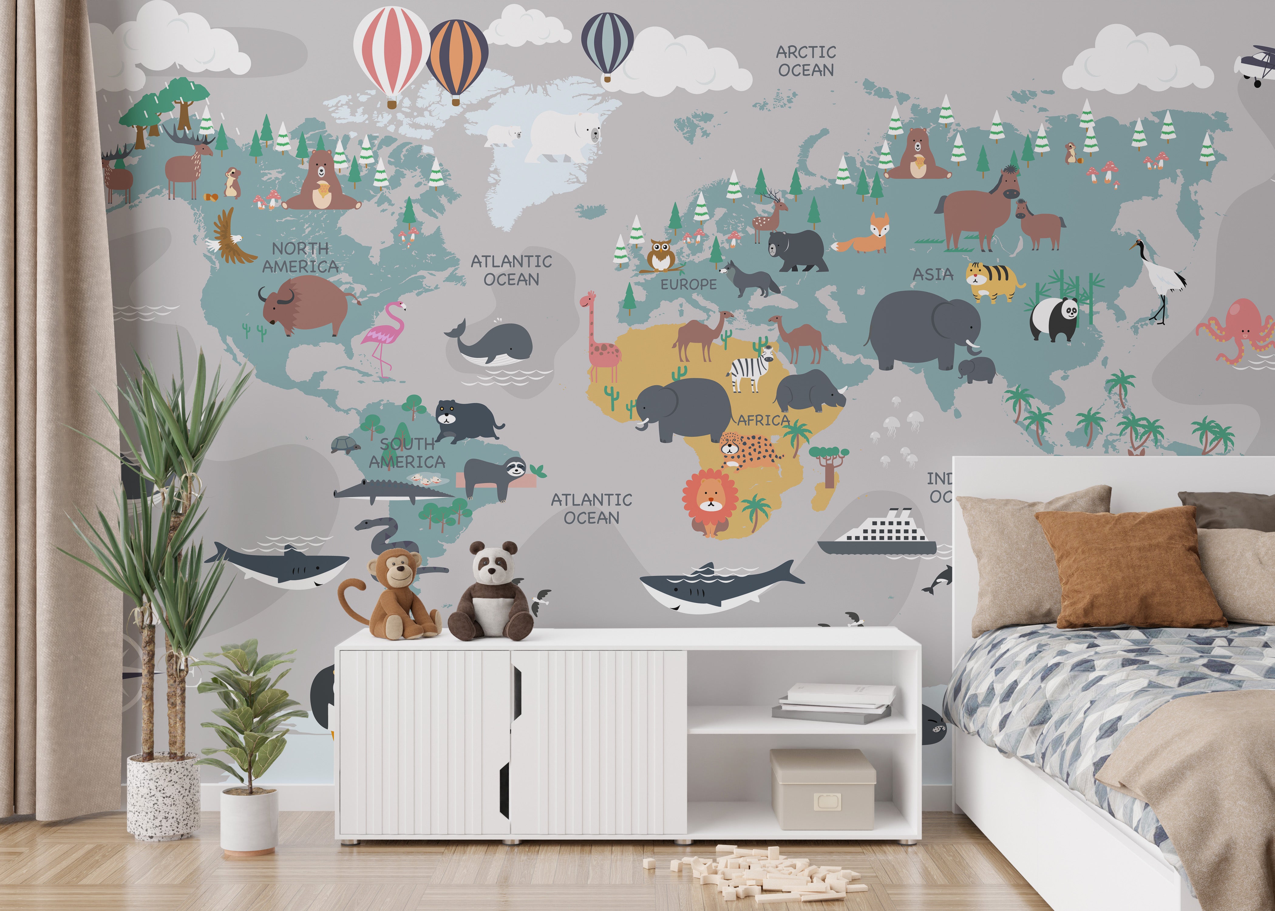 This enchanting childrens room world map wallpaper is a delightful addition to any child's bedroom or play area. Designed to captivate young minds, this mural features a colourful and engaging world map adorned with cute, playful animals representing different regions, making it educational and fun. The vibrancy of the colours and the charming animal illustrations will spark curiosity and inspire learning about the world. Perfect for creating a bright and cheerful atmosphere, this wallpaper is ideal for kids who love animals and exploring. Its durable material ensures it can withstand the energy of playtime and the wonders of childhood imagination. This kids room wallpaper adds a whimsical touch to the decor and serves as an interactive tool for parents and children to explore geography together. It's an imaginative way to bring the world closer to your little ones, filling their room with adventure and joy.