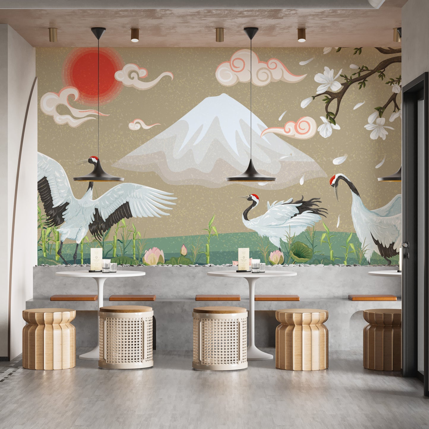Convert your living space into a haven of tranquility with the Spring Time Mountain Wallpaper Mural. Immerse yourself in the serene sunset, as the beige backdrop infuses calm into your surroundings. Adorned with delicate Chinese calligraphy, clouds, cranes, and flowers emerge gracefully, symbolizing vigilance and good fortune. This trendy Mountains Spring wallpaper wall mural, with its self-adhesive properties, offers both style and convenience. Perfectly suited for bedrooms and living areas, it pairs exquisitely with bright-colored furniture to create a striking contrast. Embrace this Spring Removable Wallpaper and invite a breath of fresh air into your home.
