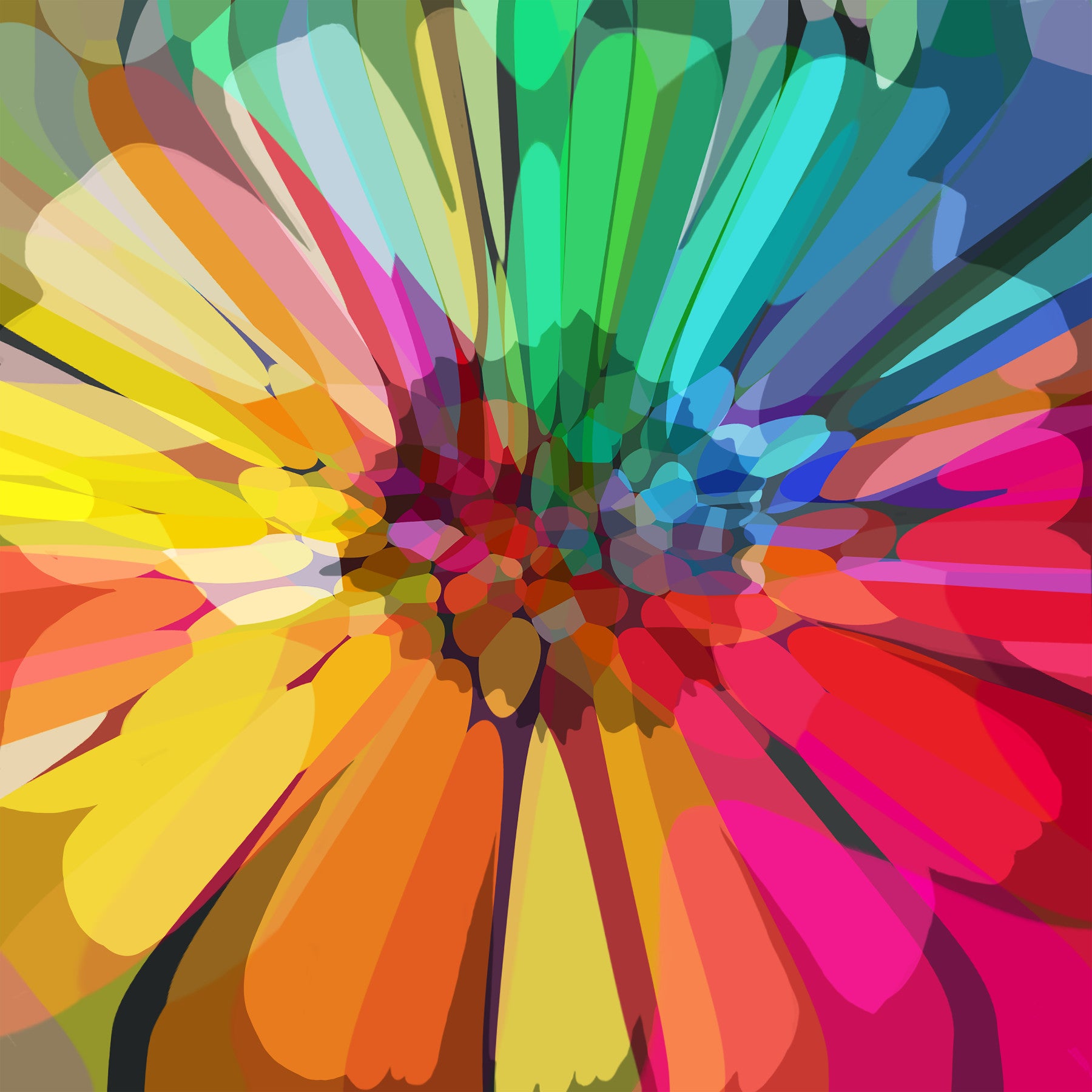 Step into a world of pure visual delight with 'Chromatic Burst.' This wallpaper presents a stunning display of color, featuring an abstract composition of translucent shapes. The interplay of reds, pinks, yellows, greens, and blues creates a captivating sense of depth and movement. Add a touch of modern artistry to your home with this bold and expressive design. Ideal for those wanting a vibrant focal point in any room.