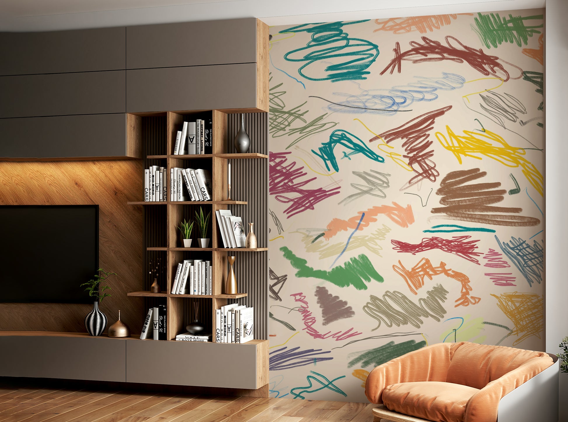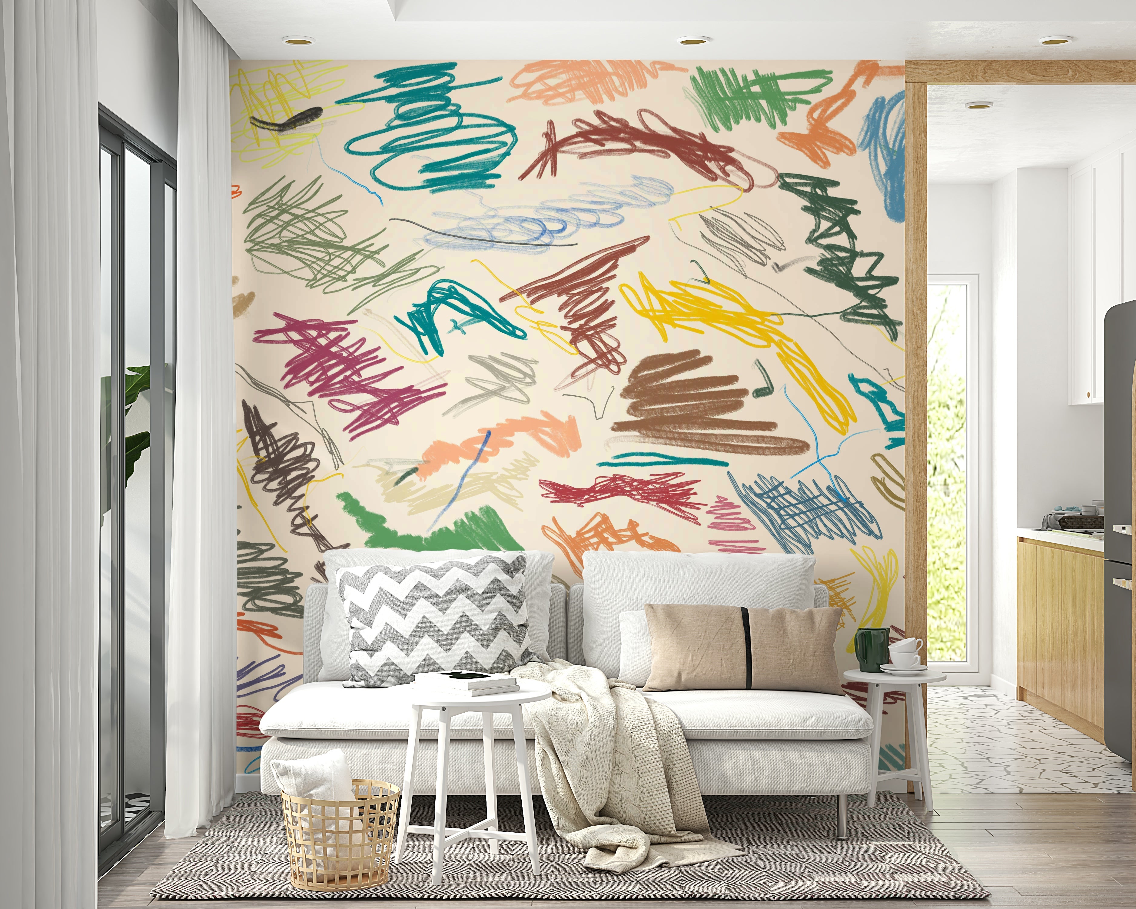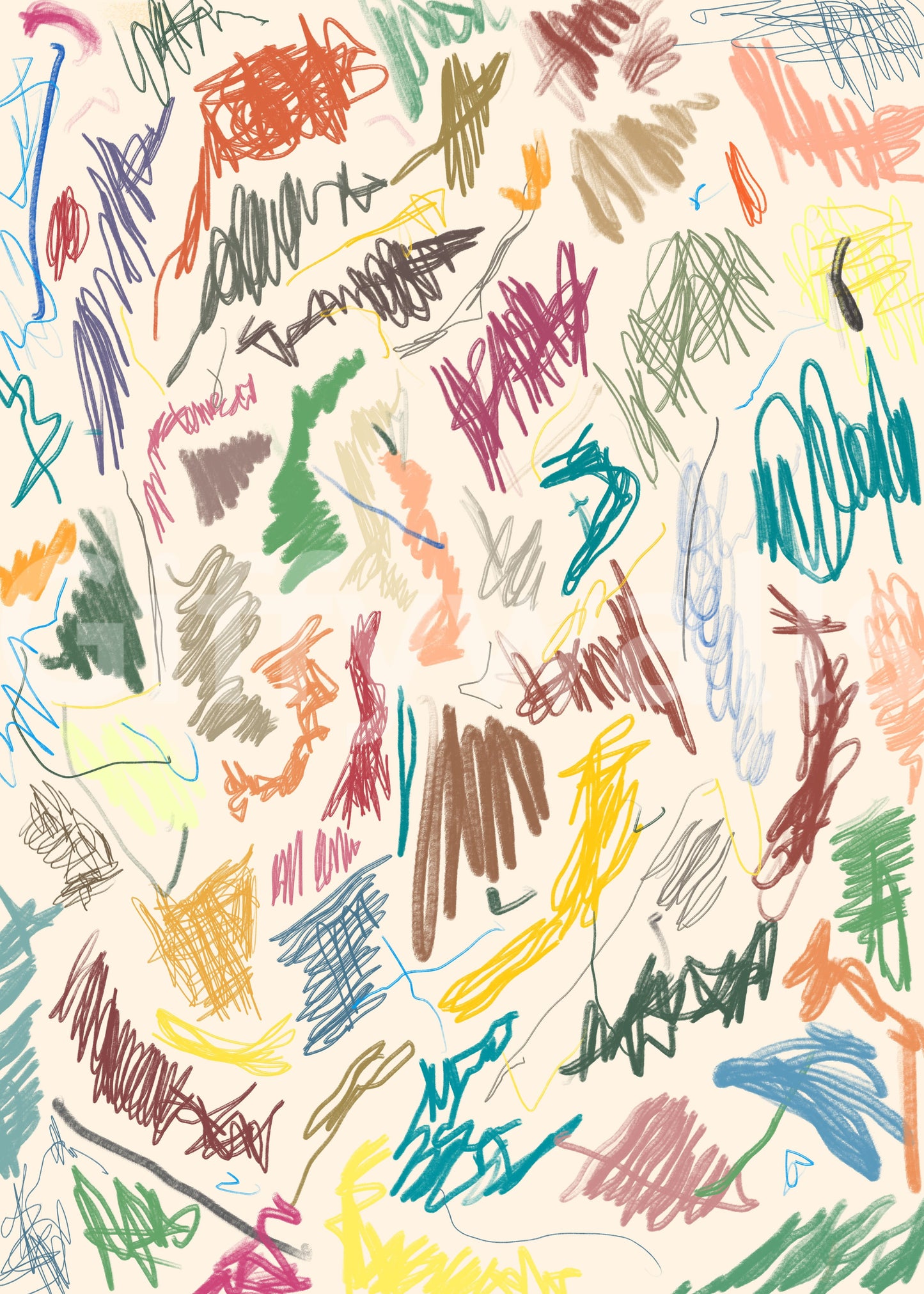 Embrace the delightful chaos of 'Cianfrusaglia,' a vibrant wallpaper design bursting with energy. A profusion of hand-drawn scribbles, lines, and shapes in a palette of warm earth tones and playful pastels dances across a creamy background. The playful, almost childlike energy of the strokes evokes a sense of joyful spontaneity. This abstract artwork is perfect for adding a touch of whimsical, artistic flair to any digital device, reflecting a mood of carefree creativity and expressive freedom. The seemingly random arrangement of marks creates an unexpectedly harmonious composition, perfect for those who appreciate a unique and expressive aesthetic.