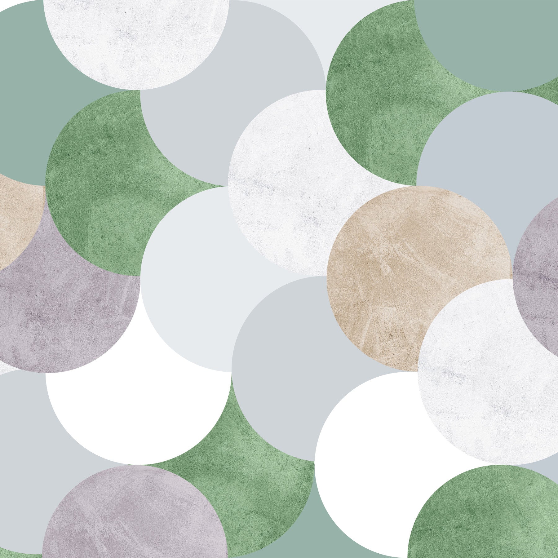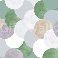 This captivating wallpaper showcases the elegance of Circle Geometric Art. A harmonious blend of muted sage greens, soft greys, and creamy beige circles create a calming and sophisticated aesthetic. The textured surface of each circle adds depth and visual interest, preventing a flat, monotonous look. The overlapping circles form a mesmerizing pattern, offering a sense of balance and subtle movement. Perfect for modern minimalist interiors, this wallpaper brings a touch of understated luxury and tranquility to any space. Its subtle color palette and organic shapes make it a versatile choice, complementing a variety of design styles.