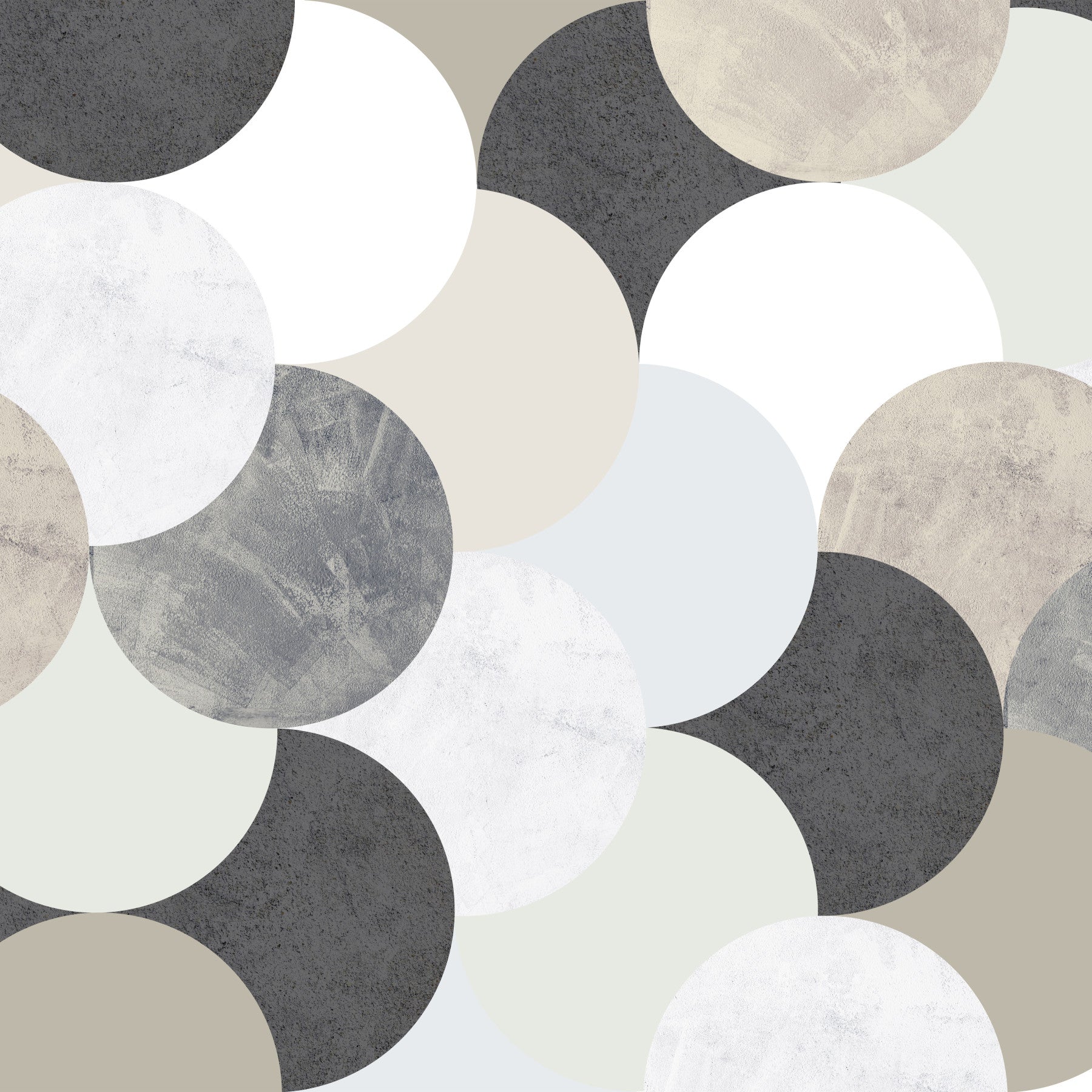 A sophisticated and calming wallpaper featuring a seamless pattern of overlapping circles in a muted palette. The design is minimalist yet striking, employing a subtle interplay of greys, whites, and beige tones. Each circle boasts a textured, almost concrete-like appearance, adding depth and visual interest to the geometric arrangement. This "Circle Geometric" wallpaper offers a modern and serene aesthetic, perfect for creating a tranquil atmosphere in any digital space. The overlapping circles create a sense of fluidity and movement, while the neutral color scheme ensures versatility and timeless appeal. It's a perfect choice for those seeking a calming yet stylish background.