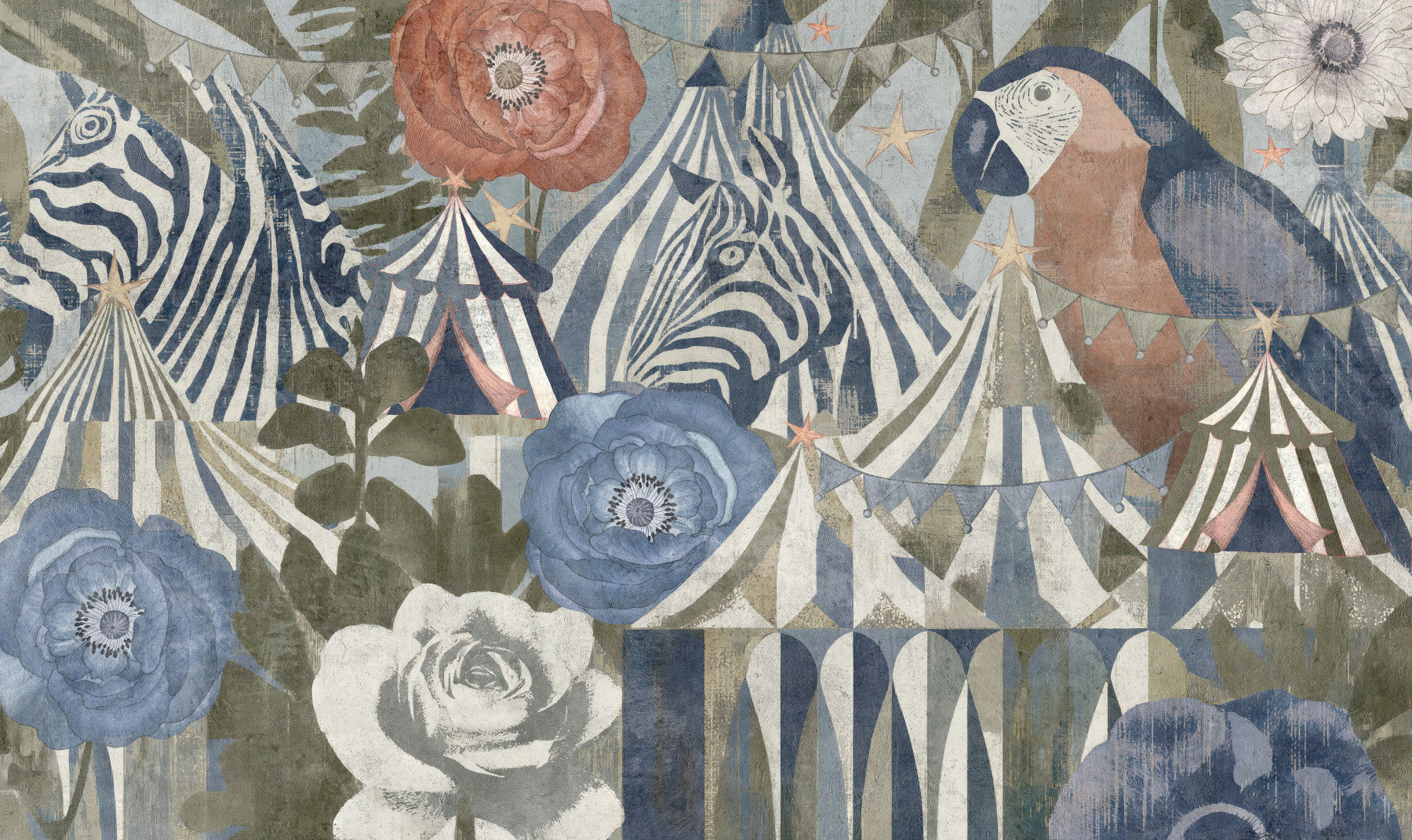Bring home a whimsical circus dream with this unique wallpaper for walls. Zebras blend with striped tents, soft flowers, and a macaw in a muted colour palette. Earthy tones and blues create a vintage feel. This eye-catching design suits a playroom, nursery, or adds a touch of fun to a hallway. It injects playful charm into interiors, creating a stylish statement that is both unique and sophisticated. Let the vintage carnival begin!