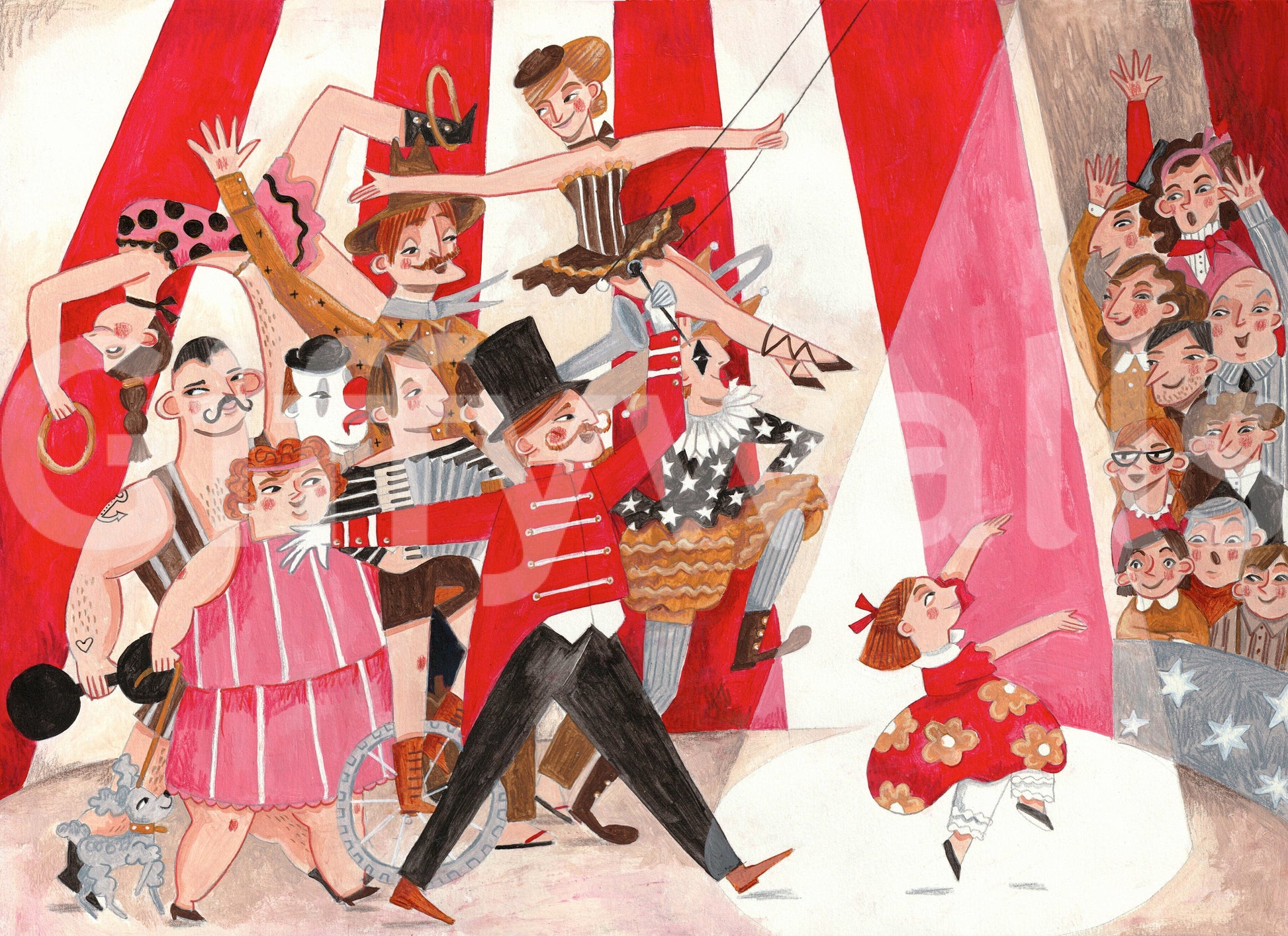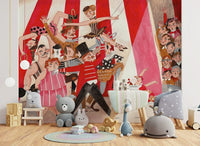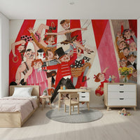 Step right up to a vibrant circus scene! This hand-drawn wallpaper bursts with energy. Watch the performers march into view – a strongman, a clown, a ringmaster, and a graceful dancer, all under the big top. Red, pink, and beige hues add charm to any room. Install this wallpaper for walls in playrooms, kids' rooms, or even a cheerful hallway. The design complements interiors with its playful art style and colourful characters, adding a touch of vintage whimsy.