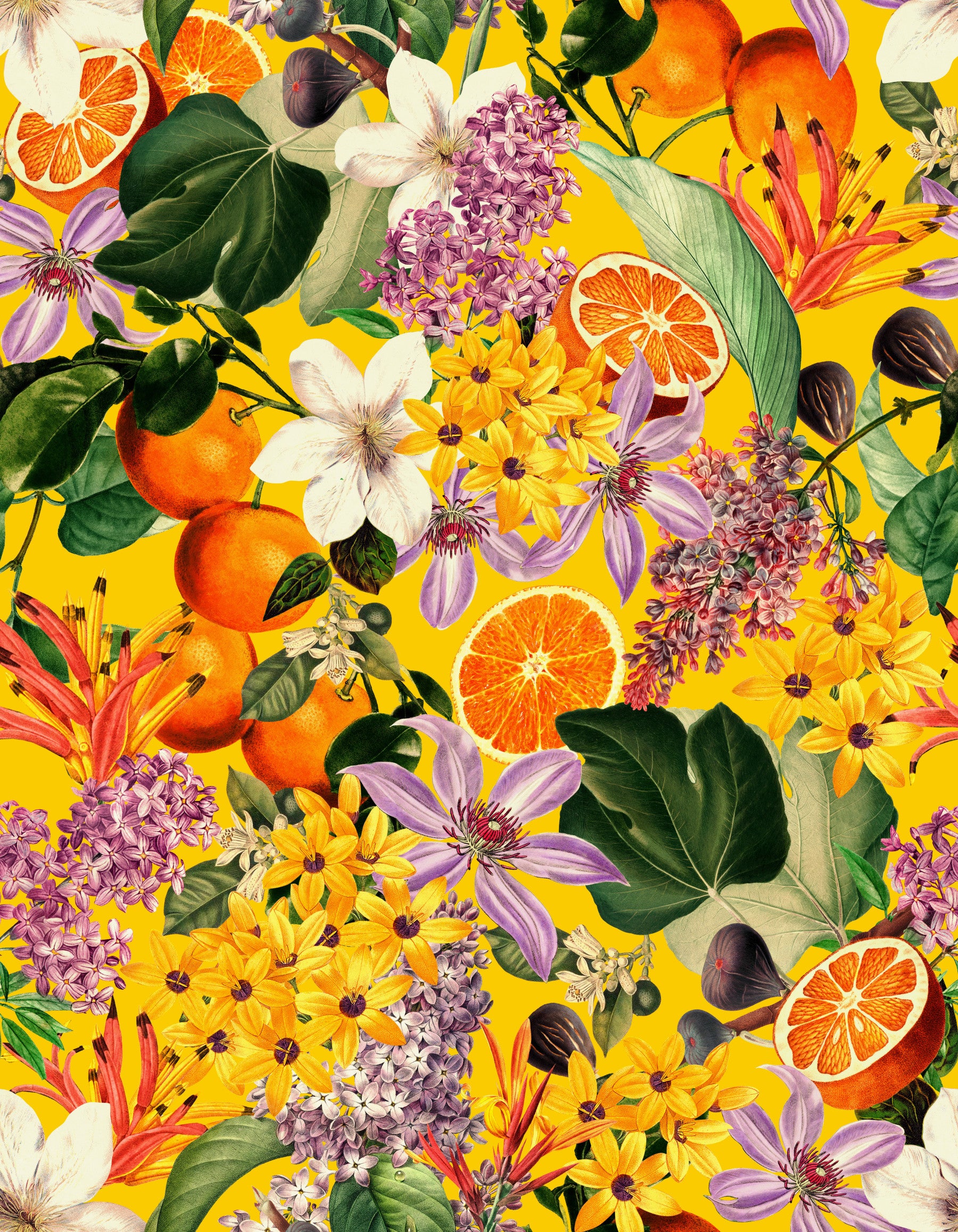 This vibrant wallpaper explodes with the joyful energy of a sun-drenched garden. A profusion of botanical illustrations, meticulously detailed, showcases the beauty of sliced oranges, ripe figs, and a breathtaking array of flowers. Lilacs in delicate purples, bright yellow blossoms, and elegant white magnolias create a harmonious yet dynamic composition against a cheerful yellow background. The seamless pattern is perfect for adding a touch of vintage charm and refreshing color to any room, evoking a feeling of warmth, abundance, and summer's sweet embrace. The high-quality design lends itself to various applications, from accent walls to complete room transformations.