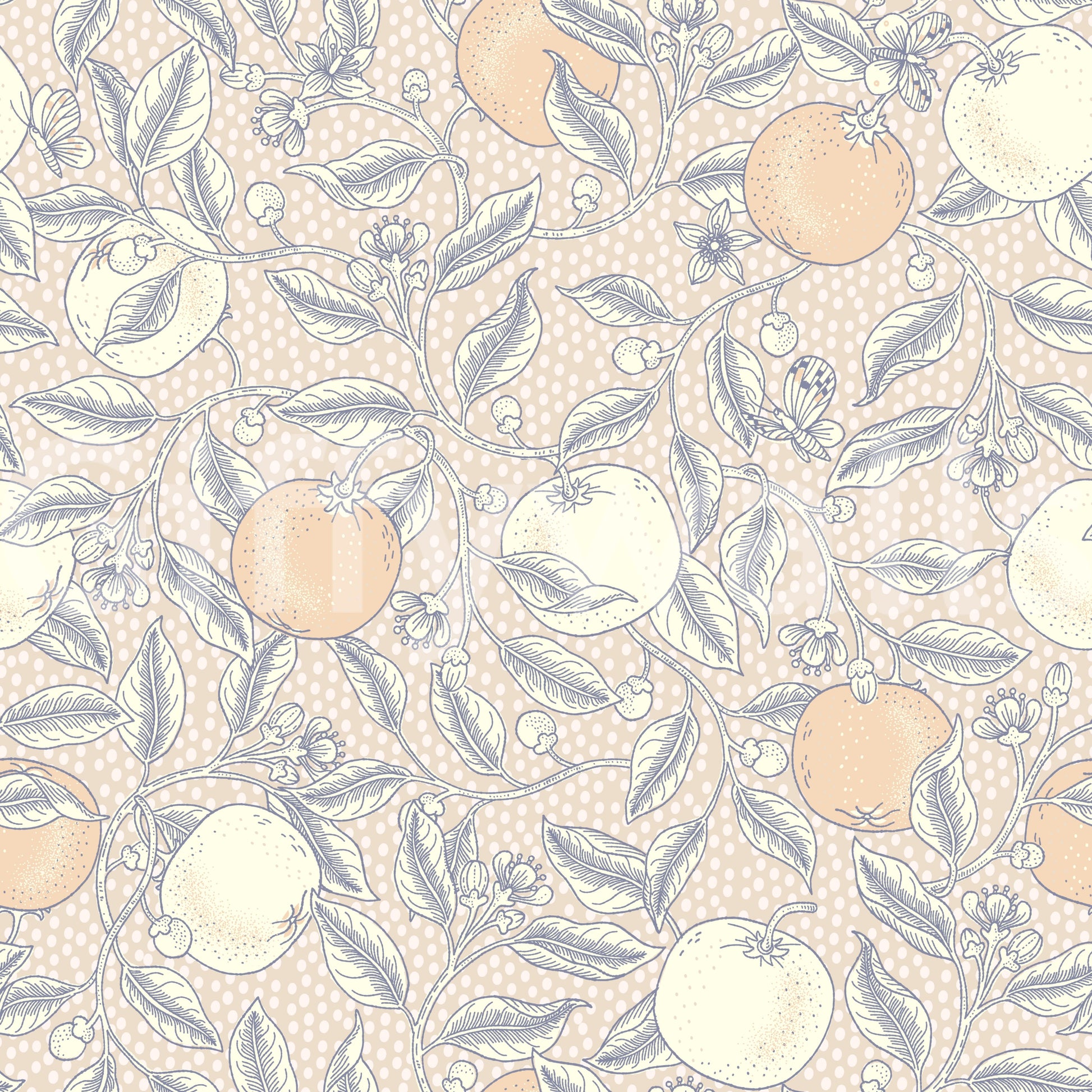 Indulge in the serene beauty of 'Citrus Squeeze in Neutral Botanica'. This wallpaper showcases a captivating botanical illustration featuring delicate citrus blossoms and ripe oranges rendered in soft, muted tones against a subtle polka-dotted background. Intricate linework and a calming color palette create a sense of tranquility and elegance. The detailed depiction of leaves, flowers, and the juicy citrus fruits evokes a refreshing, natural ambiance, perfect for adding a touch of understated sophistication to any digital space. Butterflies flutter gently amongst the branches, completing this idyllic, nature-inspired design.