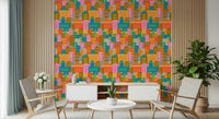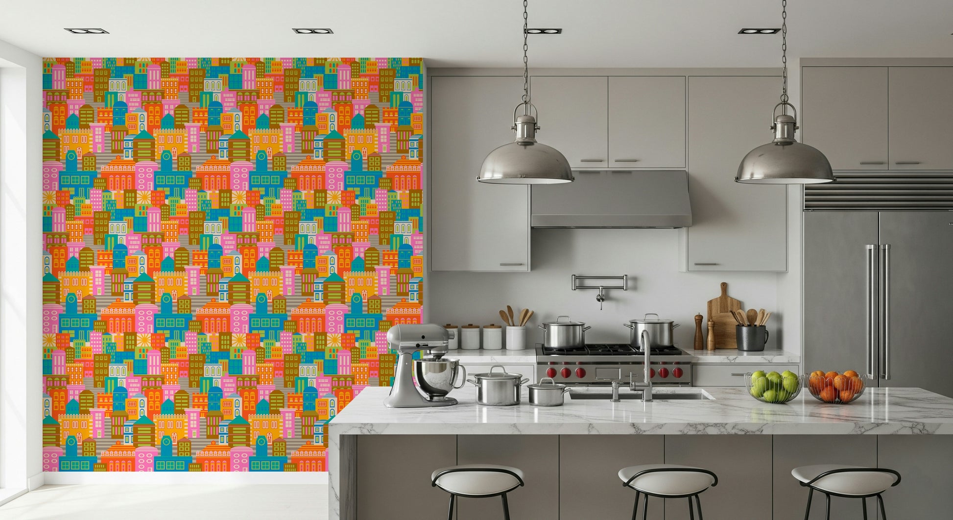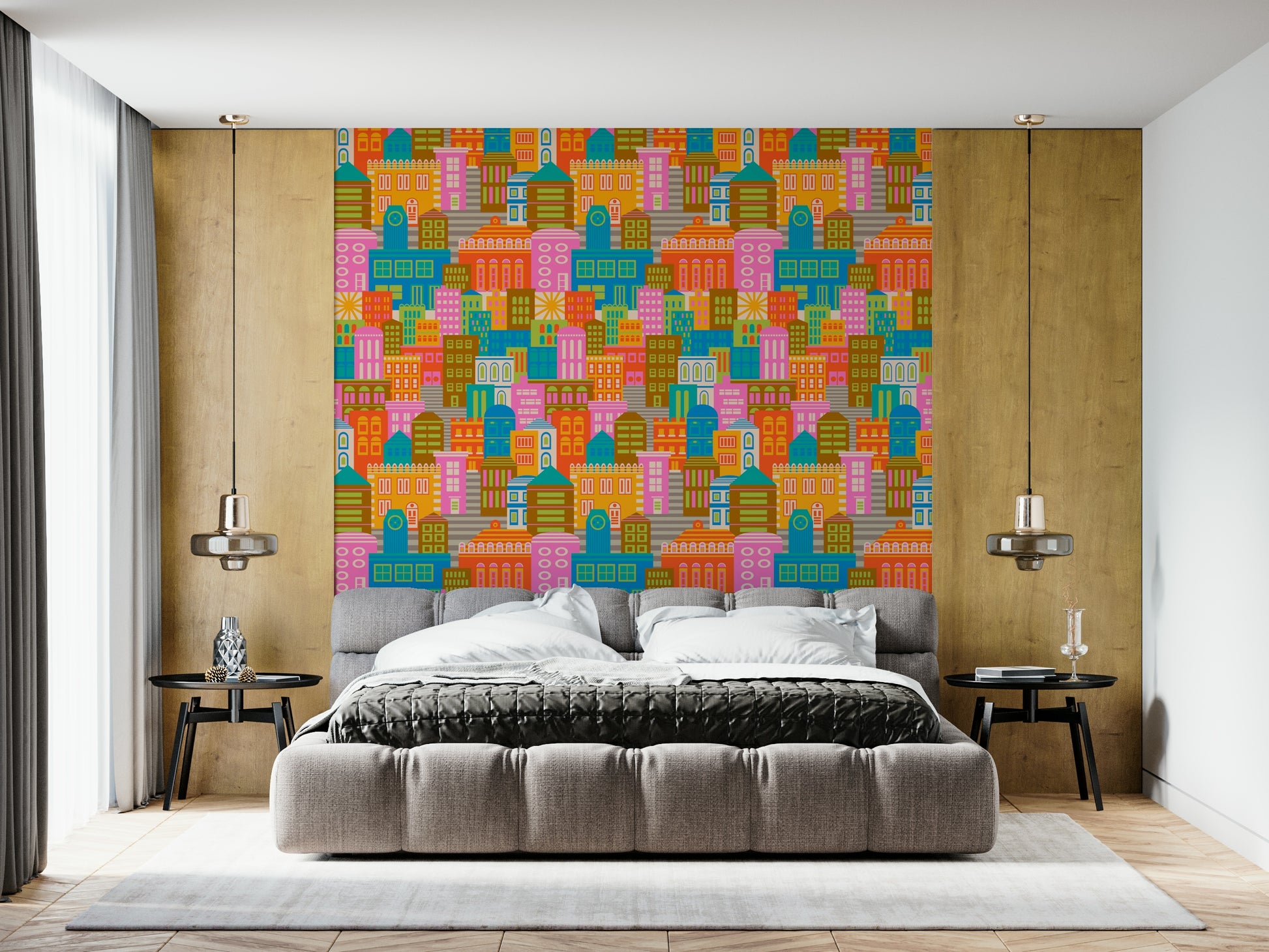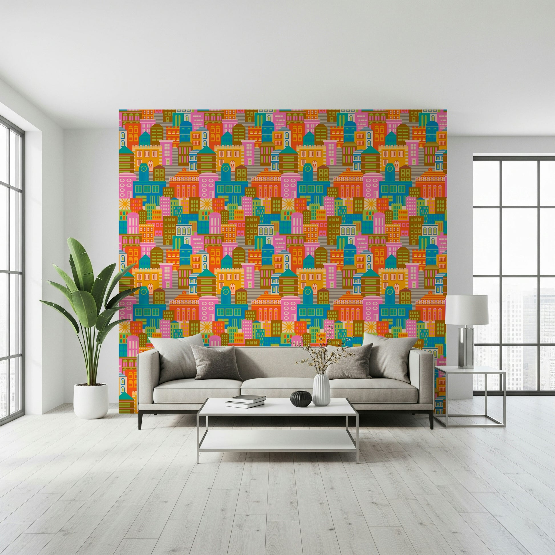 City Lights By Day Vintage Travel Bright Geometric Buildings Sunshine Rainbow Brights Wallpaper⁠