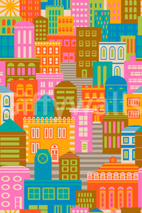 Geometric, colourful architecture buildings, high-rises and houses with sunshine in fun retro Rainbow Brights: Royal Blue, Coral Orange, Yellow, Pink, Turquoise, Green, Brown and White with striped backdrop! Bright, pop and fun cityscape inspired by vintage travel posters! This Repeat Pattern Design is also available in a Wall Mural version too! Also see my co-ordinating "City Lights At Night" pattern design and wall mural. Original wallpaper pattern design by Jackie Tahara of UnBlink Studio.