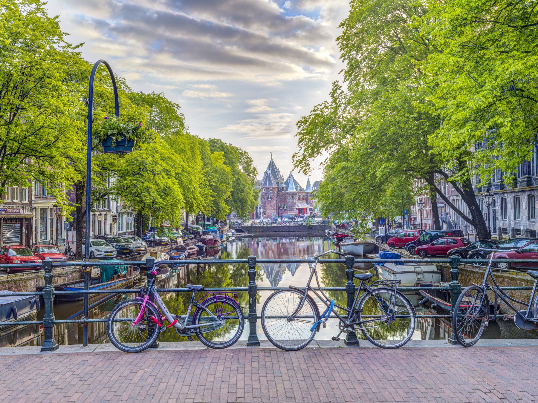 Charming Amsterdam canal-side scene with vibrant bicycles for your space.