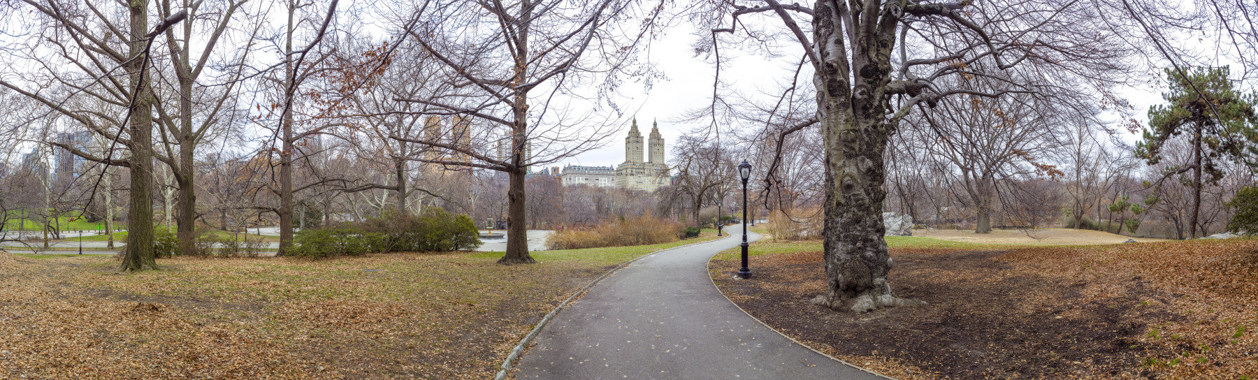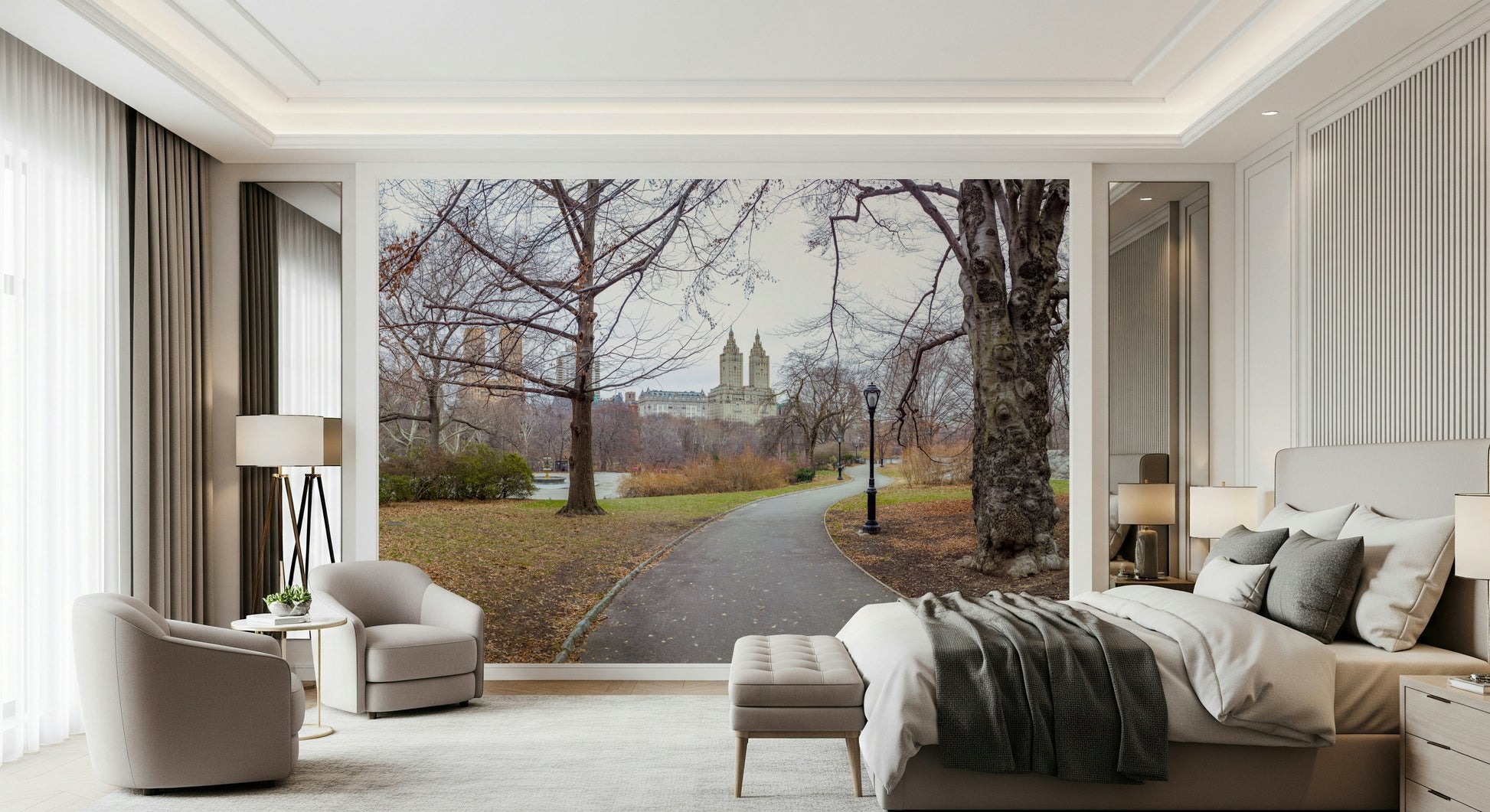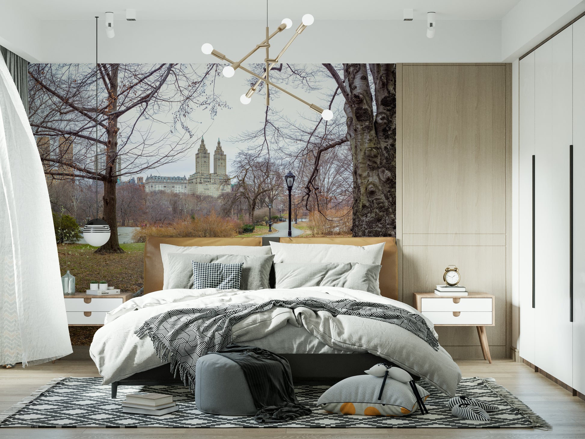 Pathway through Central Park, New York. This wallpaper displays a city park framed by bare trees against an architectural backdrop. The winding path creates a sense of peace and the neutral colours soothe the eyes. This design works great as wallpaper for walls in any living space. The blend of city and nature elements allows it to complement a range of interior designs. From contemporary to classic, it brings a touch of the outdoors and adds depth to any room.