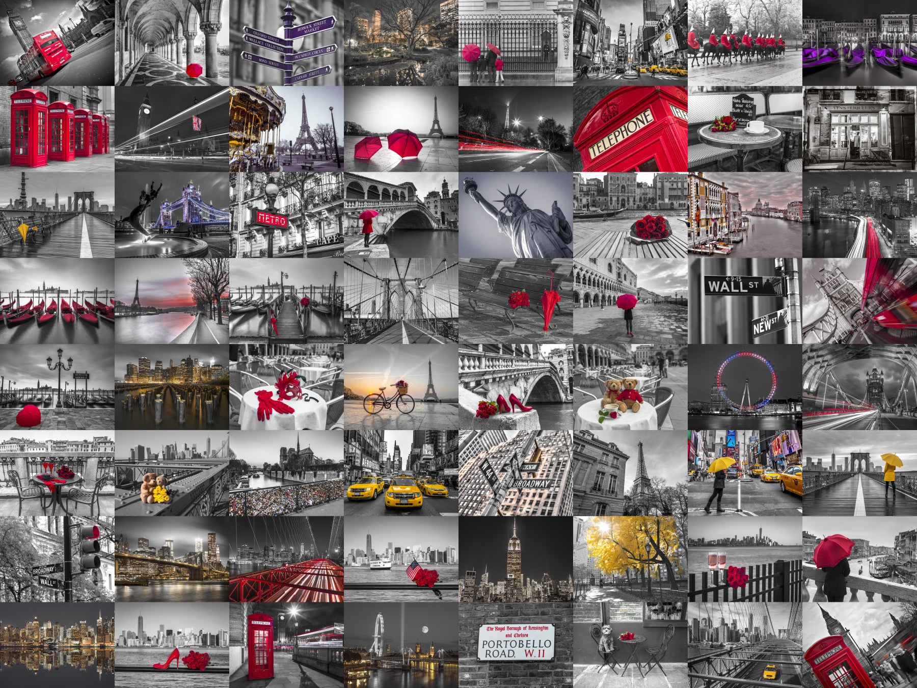 Vibrant cityscape collage mural featuring iconic landmarks.