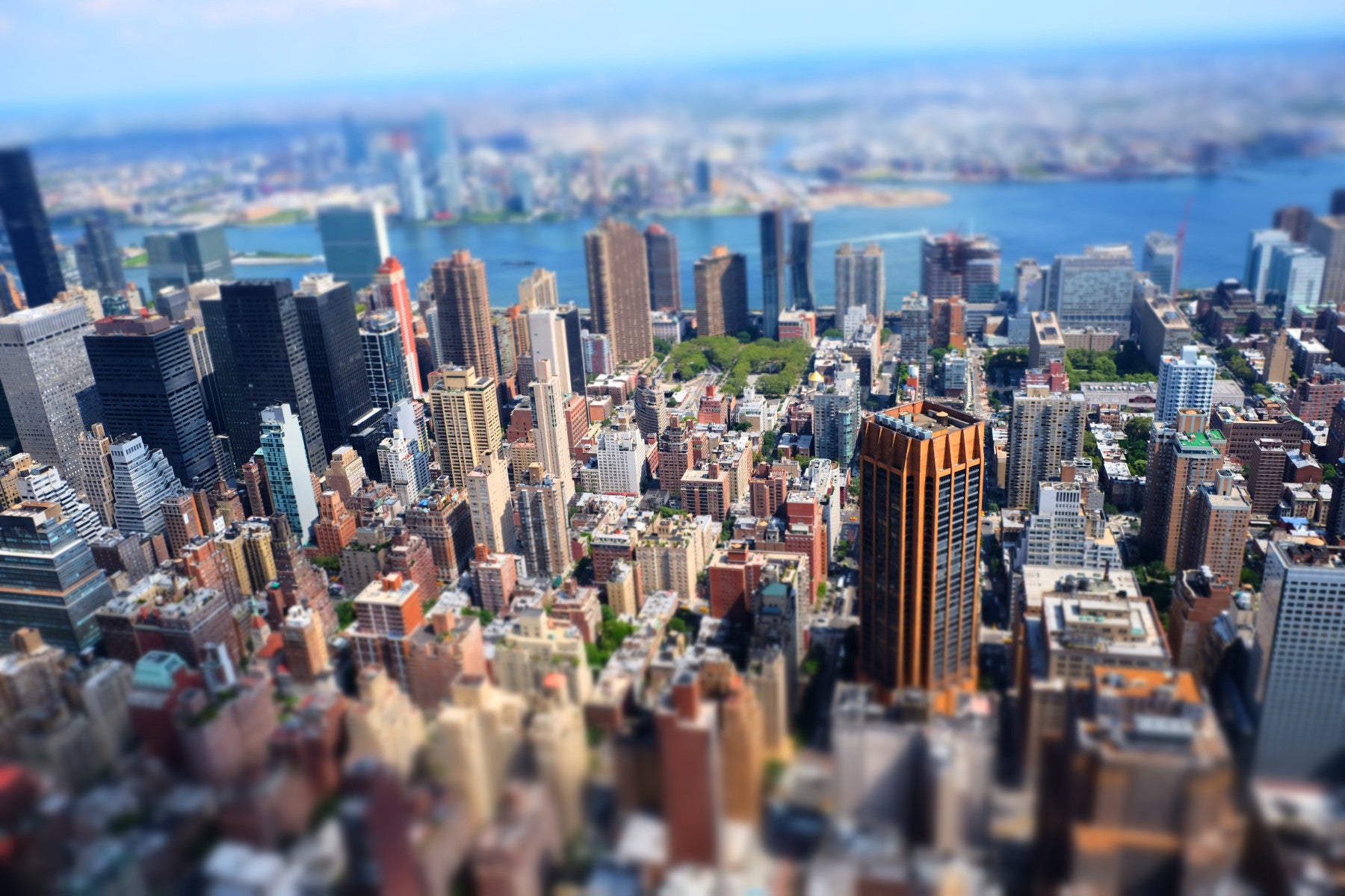 Bring the energy of New York City into your home with this stunning cityscape wallpaper for walls. The tilt-shift effect blurs the distance and emphasises the architectural details. Warm hues of brick and beige contrast with the cool blues of the sky and river. Perfect for a modern living room, home office, or teen room. This wallpaper evokes a sense of wonder and urban exploration, bringing a dynamic, metropolitan vibe. This design complements interiors that crave a touch of city charm.