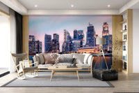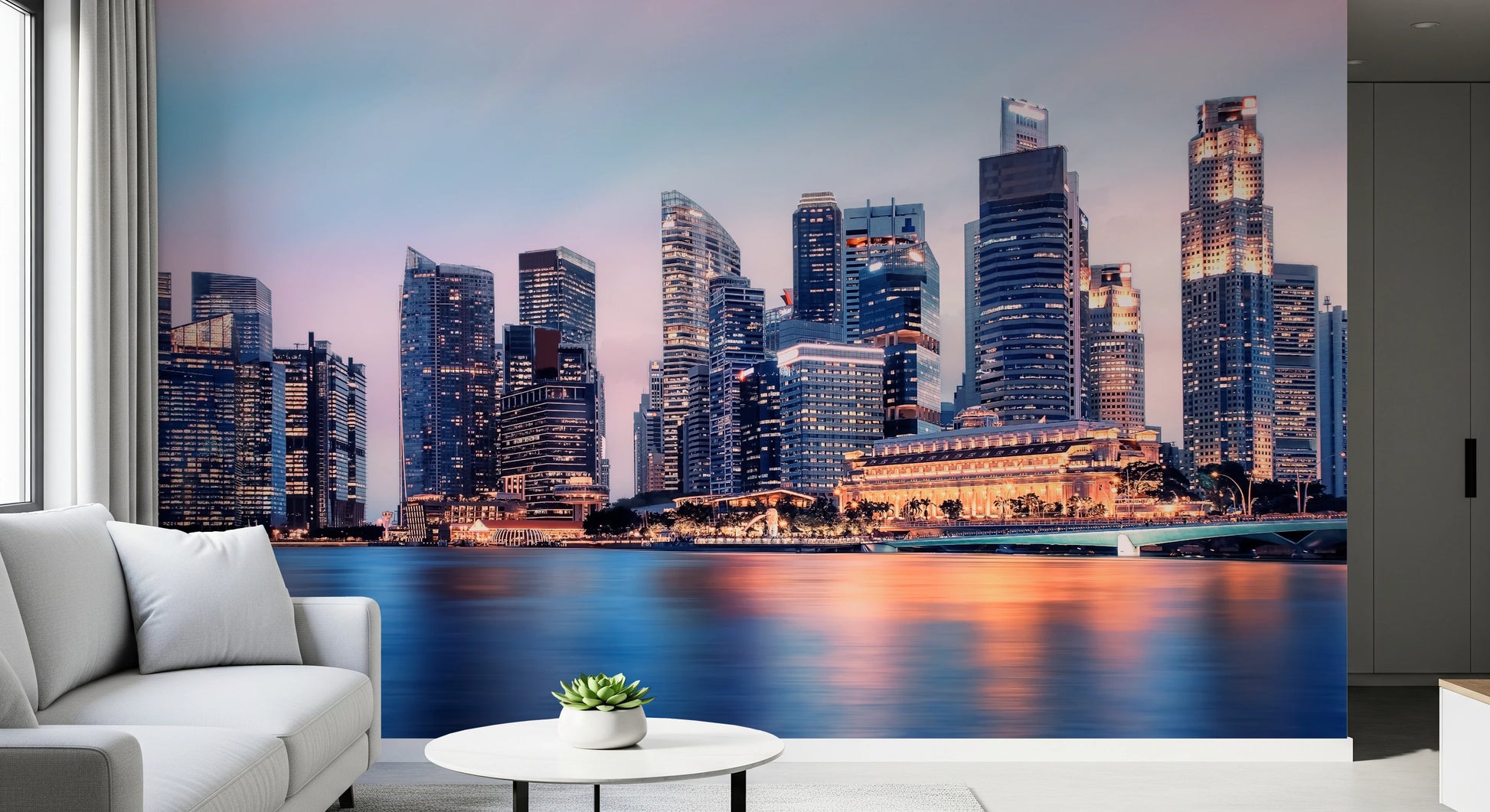 Transform your space with this breathtaking cityscape wallpaper for walls. The design captures a stunning skyline bathed in the soft glow of twilight, with the city's lights mirroring beautifully on the water's surface. The cool blues and warm oranges create a calming yet vibrant atmosphere. This wallpaper works wonders in living rooms, bedrooms, or even a home office, adding depth and sophistication. It complements modern and minimalist interiors, bringing a touch of urban elegance to any room. Let this cityscape become the centrepiece of your interior design.