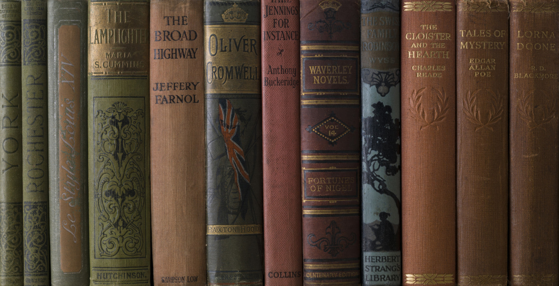 Antique book spine pattern of Classic Literature Shelf wallpaper.
