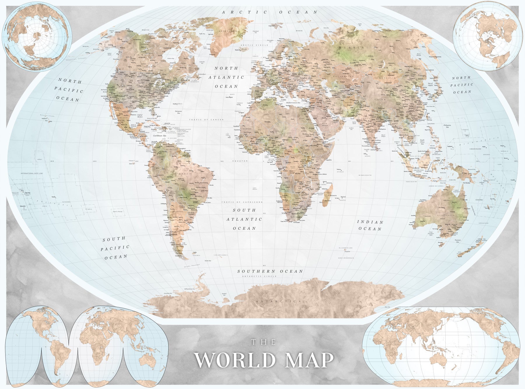 Embark on a journey through time and space with this meticulously crafted world map, presented in a soothing palette of blues and earthy tones. This isn't just a wall decoration; it's an invitation to explore the globe from the comfort of your own space. The continents are rendered in nuanced shades of beige, tan, and brown, evoking a sense of natural history and organic beauty. These warm, earthy tones contrast elegantly with the tranquil blue hues that define the oceans, creating a visually harmonious and calming atmosphere.