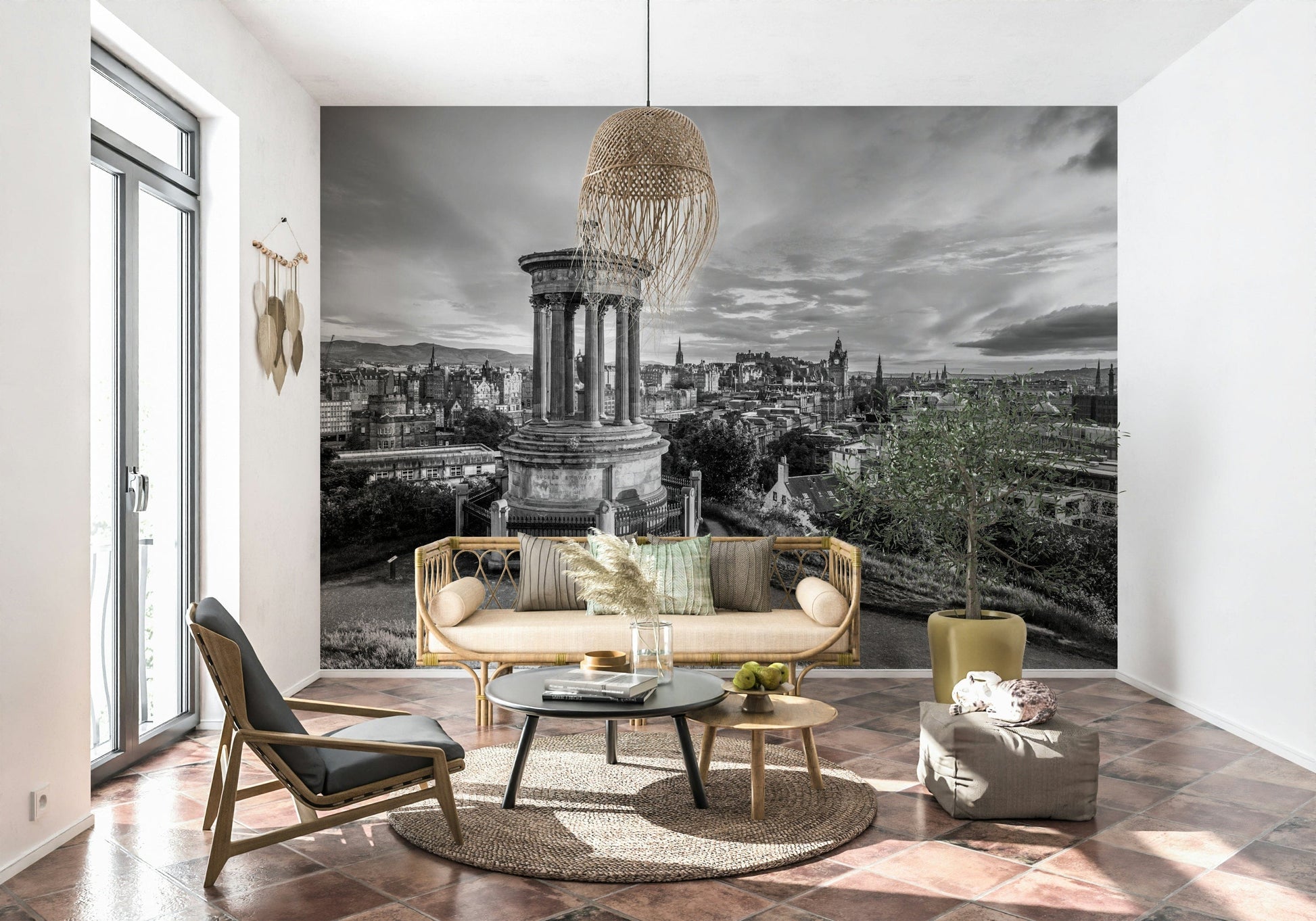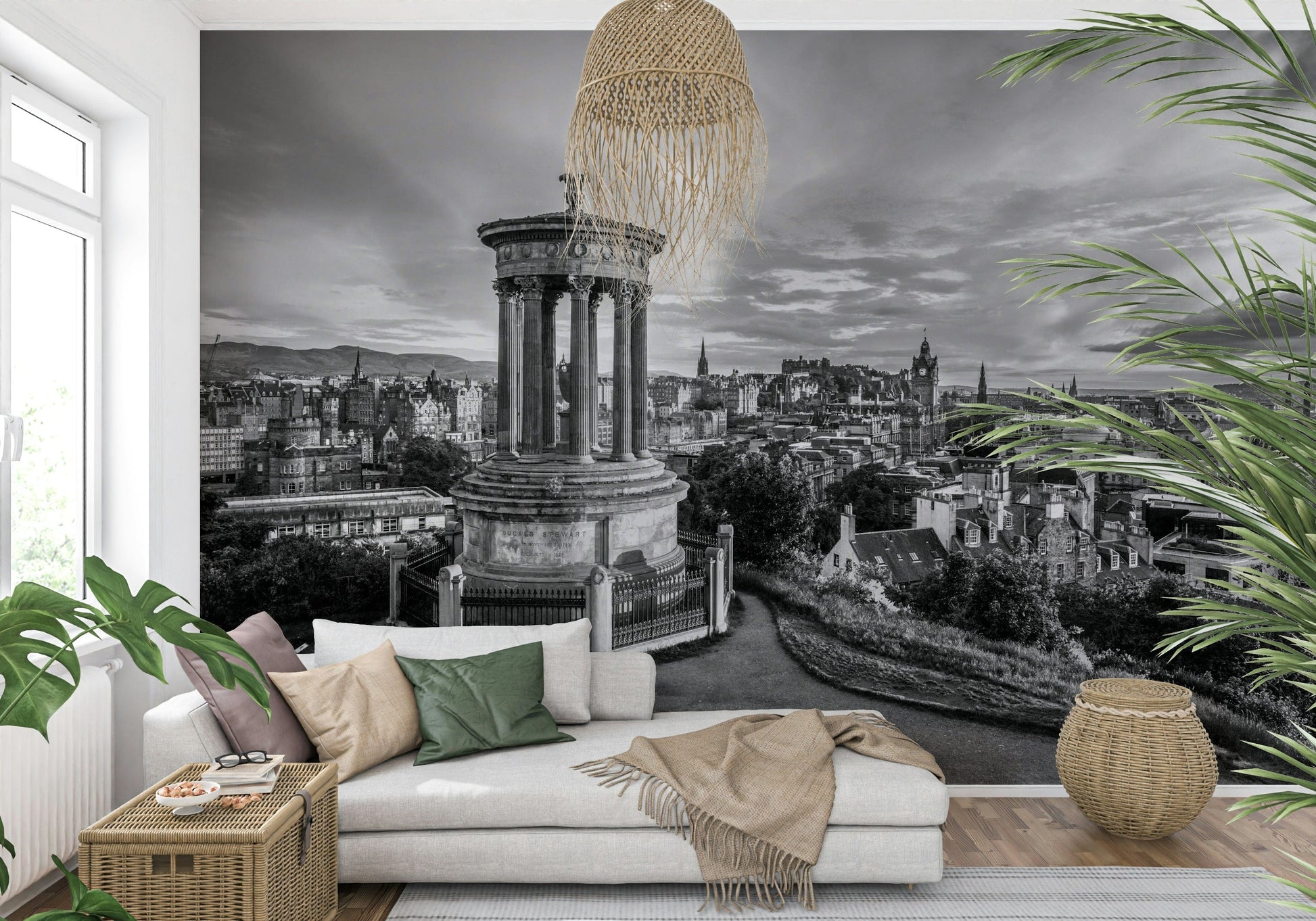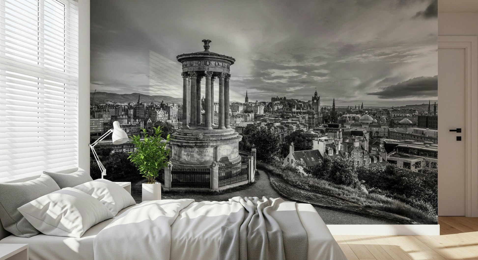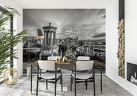 Edinburgh cityscape from Calton Hill, Scotland. Immerse your space in the timeless elegance of 'Classical City Charm.' This striking wall décor captures a majestic cityscape in monochrome, dominated by a neoclassical monument that anchors the composition. A sprawling urban landscape unfolds, revealing architectural details and a sense of history etched into every building. The sky, alive with cloud formations, adds depth and drama, creating a captivating backdrop for the cityscape. The monochrome palette highlights the intricate details of the monument and the surrounding city, adding to the overall grandeur and sophistication. Elevate any room with this piece, which evokes a sense of historical depth, architectural beauty and classic charm, transforming your walls into a window to the past.