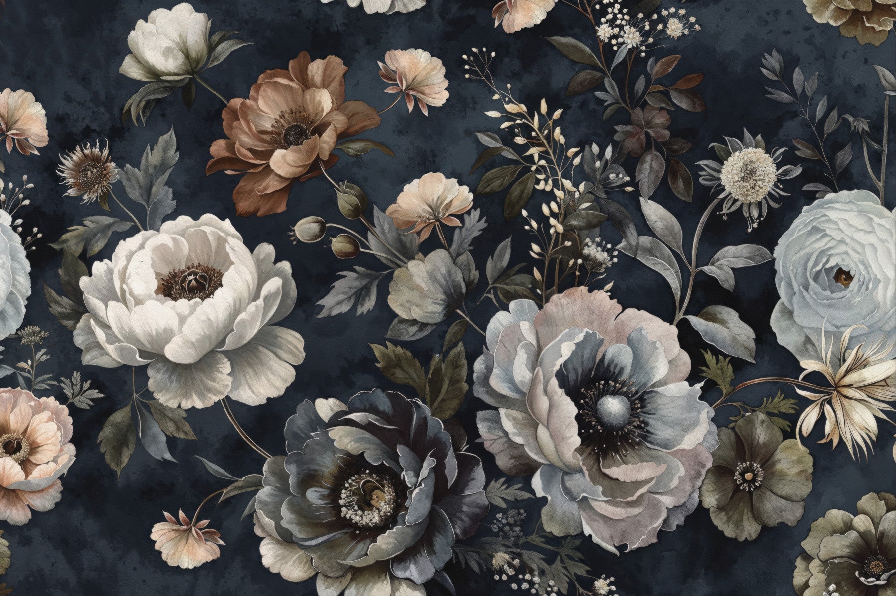 Transform your living space with this classic yet timeless opulent botanical illustration. The elegant design features a rich tapestry of blooming flowers set against a dramatic dark backdrop, perfect for creating a striking feature wall. Ideal for adding a touch of timeless sophistication to any room, this wallpaper's intricate floral patterns are sure to captivate and inspire. Enrich your home decor with this classic yet contemporary piece that effortlessly complements a variety of interior styles. Looks amazing on a bedroom or dining area statement wall but you can also use it to refurbish and pimp a hotel room or give a store, office or restaurant an individual and exquisite style