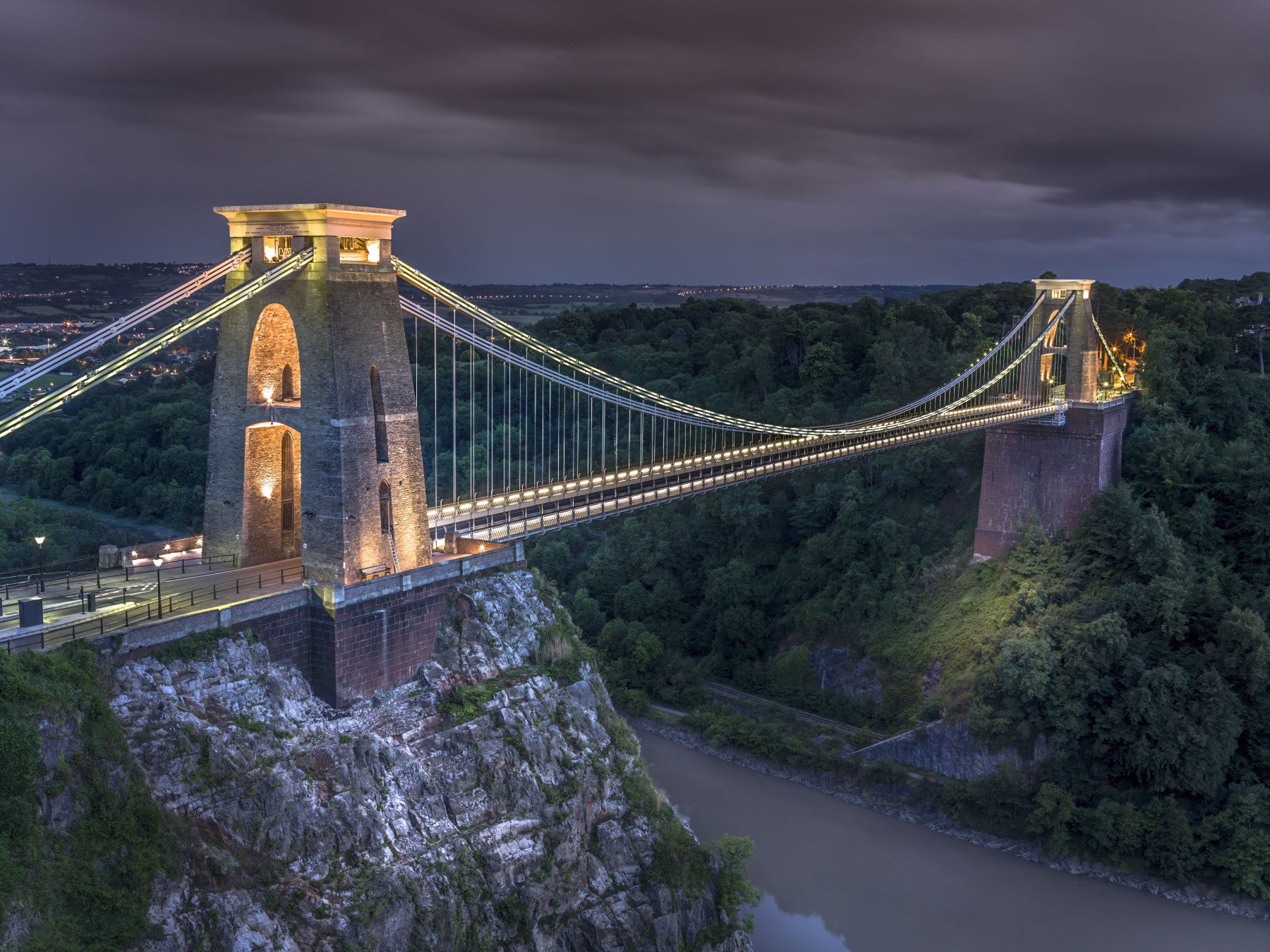 Witness the iconic Clifton Suspension Bridge in its illuminated glory against a twilight canvas. This stunning wallpaper captures the architectural marvel spanning the Avon Gorge, showcasing its intricate web of suspension cables and the warm glow emanating from its towers. The image evokes a sense of awe and tranquility, highlighting the bridge's grandeur as it connects history and nature. The surrounding lush greenery and the softly lit cityscape in the distance add depth and context to this breathtaking scene. Perfect for those who appreciate engineering feats, scenic beauty, or simply desire a touch of elegance on their digital screen, this wallpaper transforms any device into a window overlooking one of Britain's most cherished landmarks. Immerse yourself in the timeless beauty of the Clifton Suspension Bridge.