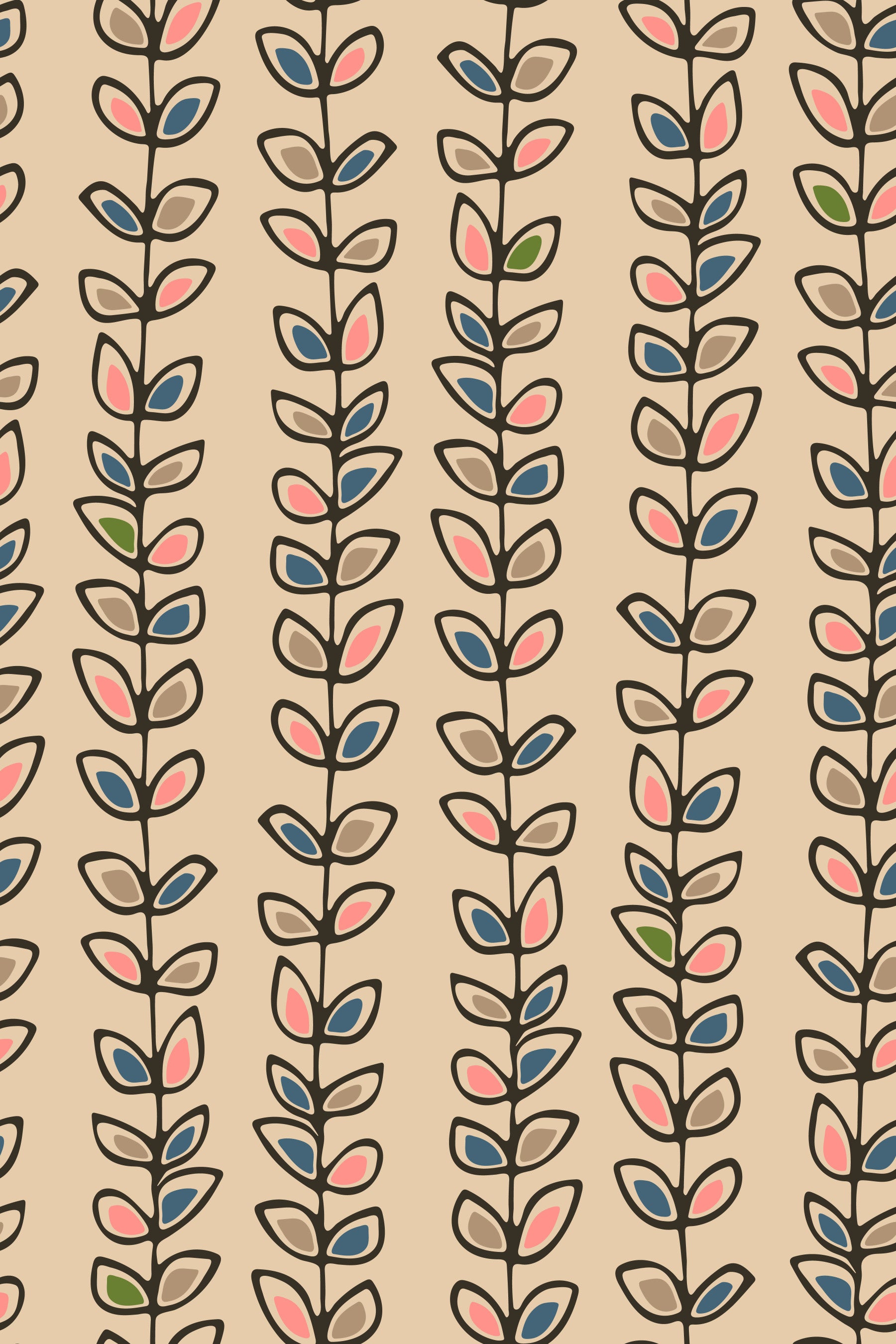 A retro leaves wallpaper featuring vertical climbing vines with colorful leaf patterns on a cream background.