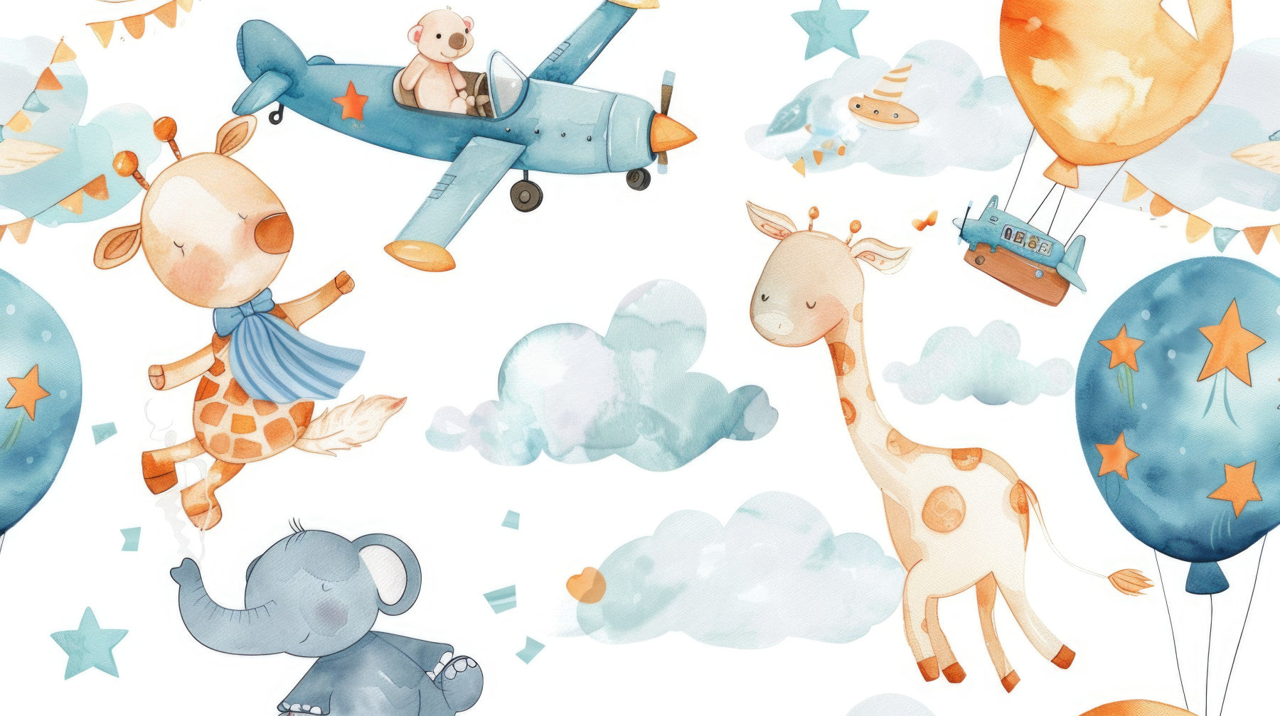 Bring a soft, whimsical feel to your space with this playful wallpaper. Watercolor-style artwork features cute giraffes, a baby elephant, and airplanes against a backdrop of gentle clouds and balloons. A palette of soft blues, oranges, and whites gives it a calming, dreamy aesthetic. Ideal for a nursery or children's bedroom. This wallpaper for walls can easily add a touch of childlike wonder to any space, making it perfect for creating a serene and imaginative environment. Complement the interiors of rooms. A sweet addition to nurseries, playrooms, and reading nooks.
