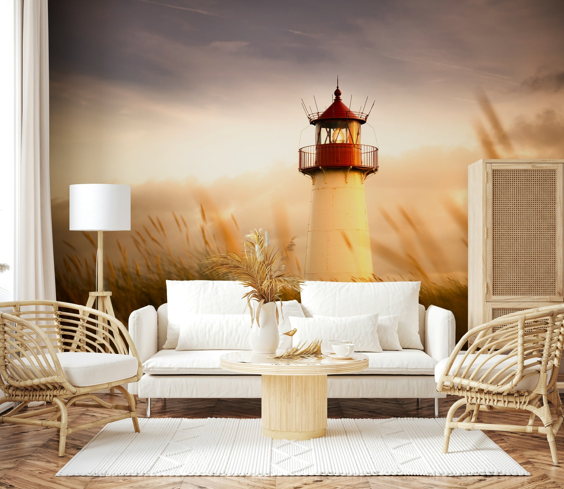Bathe your walls in the serene glow of this coastal image. A bright lighthouse, set against a soft sunset sky, provides a focal point with its clean lines and red accents. The foreground's tall grass adds texture and depth. Perfect for a living room, bedroom, or home office, this tranquil scene brings a touch of nature indoors. Choose this scenic wallpaper for walls to create a calming and inviting atmosphere that complements various decor styles.