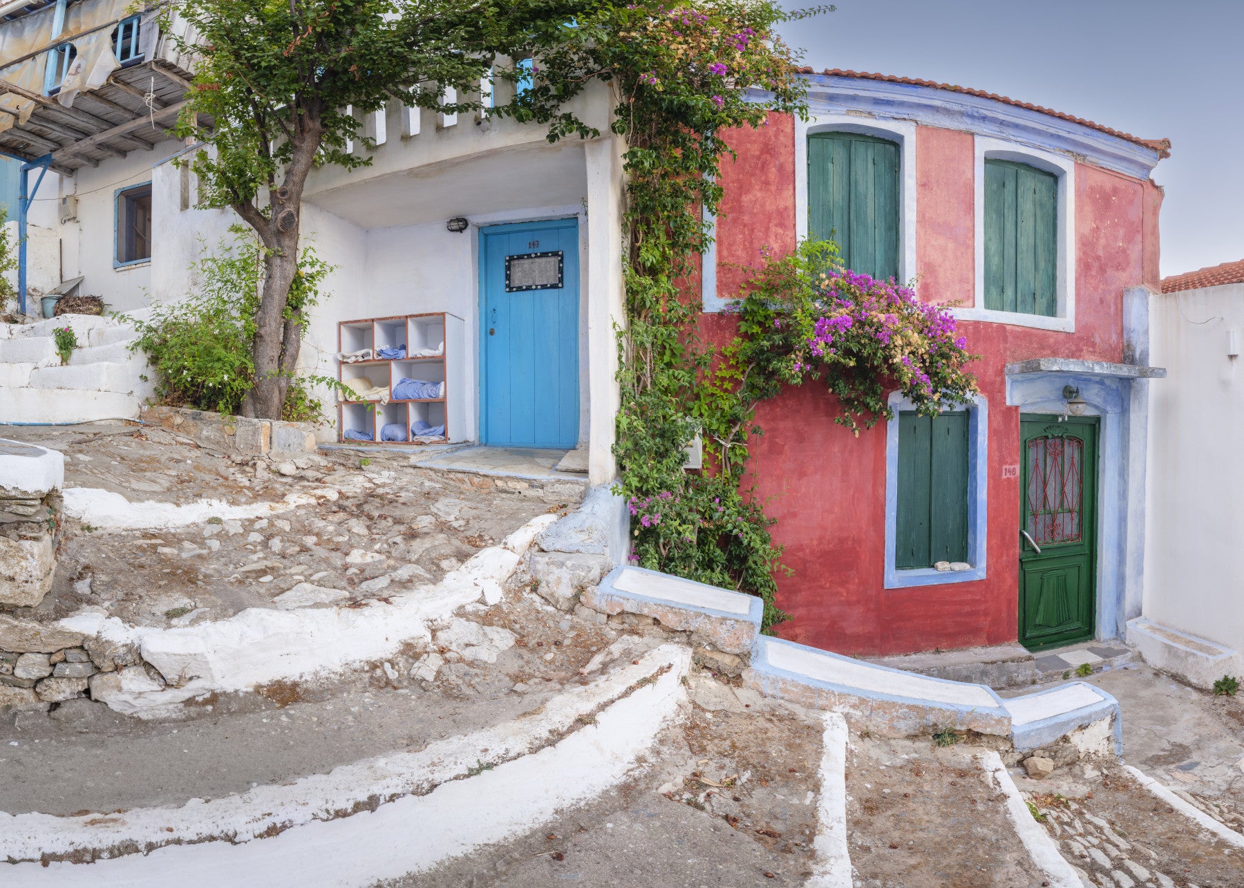 Coastal Cottage Charm: Sun-drenched Symi village scene.